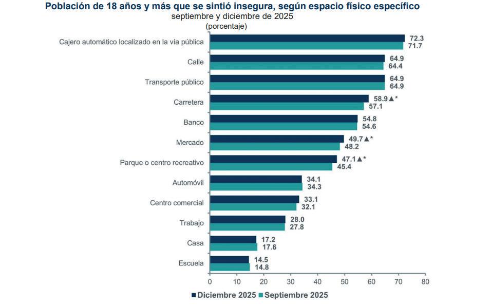 A nivel nacional, la percepción de inseguridad en espacios físicos específicos también se mantuvo elevada. En diciembre de 2025, el 72.3 % de la población manifestó sentirse insegura en los cajeros automáticos localizados en la vía pública; el 64.9 %, en las calles; el 64.9 %, en el transporte público, y el 58.9 %, en la carretera.