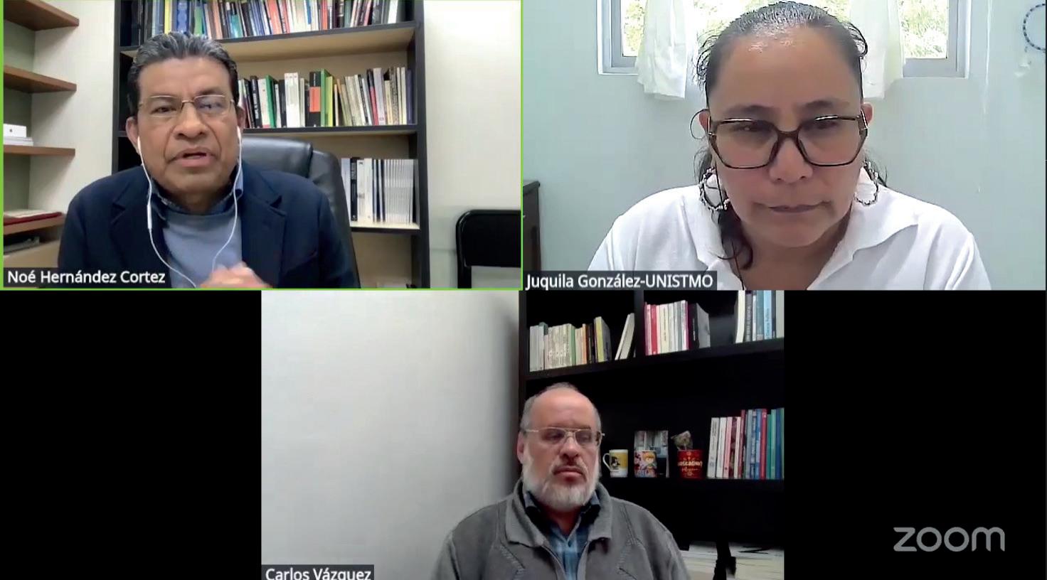 Noé Hernández Cortez y Carlos Vázquez Salazar, investigadores de la BUAZ, en el foro Diálogos por la Paz, organizado por la Universidad del Istmo. Foto: Captura
