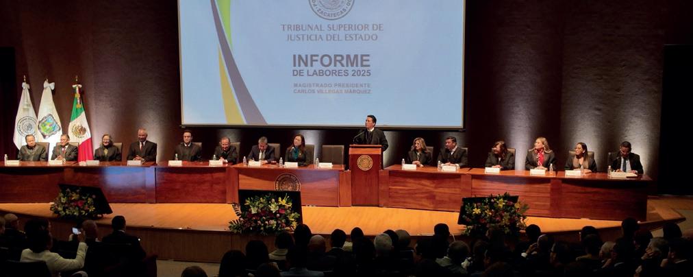 En su primer informe tras la reforma judicial, el magistrado presidente del Tribunal Superior de Justicia del Estado (TSJEZ), Carlos Villegas Márquez, se refirió a una tersa transición, pese a tratarse de cambios estructurales profundos. El informe describió un incremento significativo de la carga de trabajo con 21 mil 332 audiencias en juzgados de control; más de 33 mil acuerdos y audiencias en horarios extendidos (noches, madrugadas y fines de semana). Foto: TSJEZ