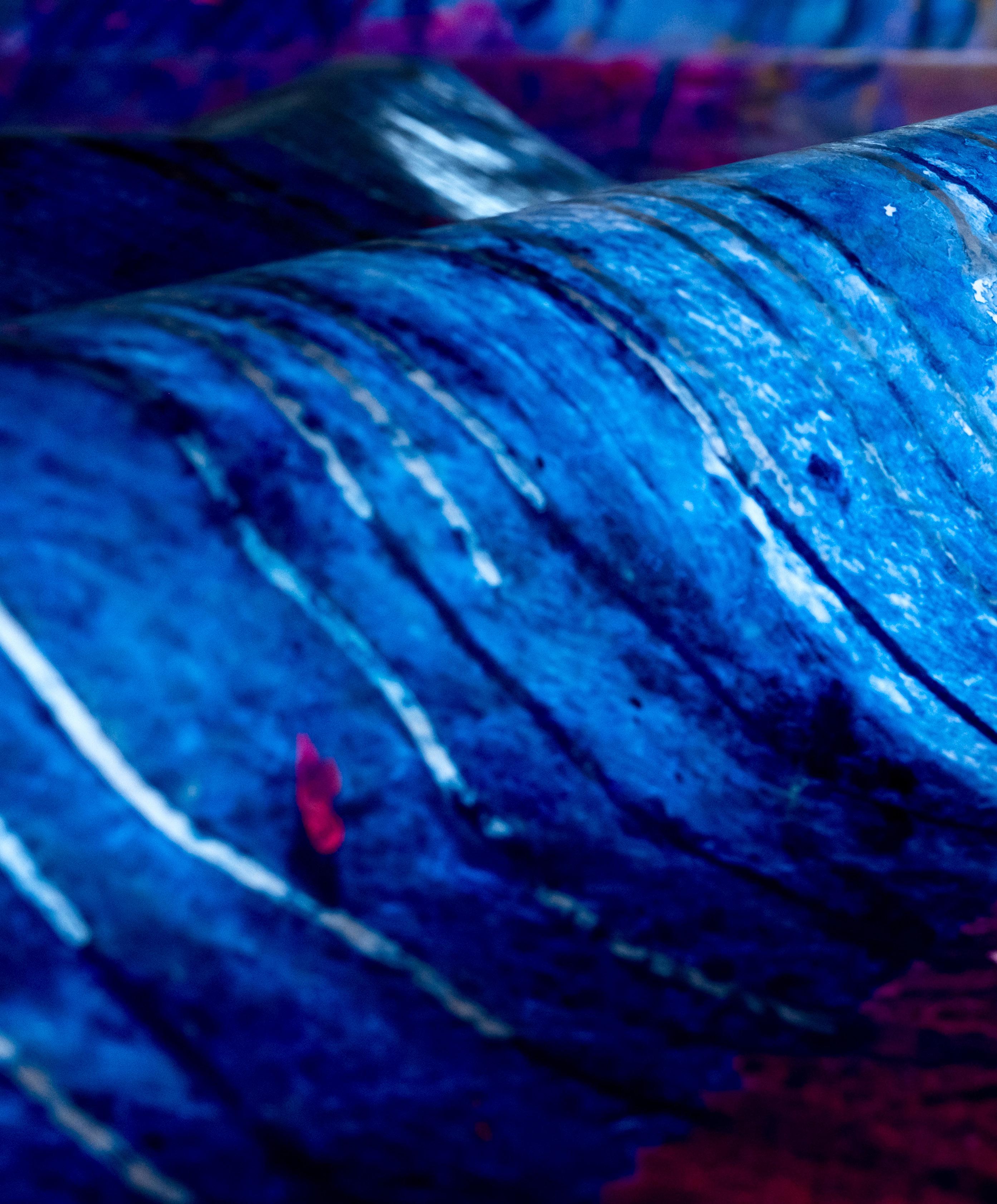 Located in the center of the second gallery, the work Water, SunSet Memories is suspended from the ceiling and occupies the entire space. The audio envelops the visitors with water soundscapes. An experiential site, the idea is to experience water at sunset, evoking memories and creating an immersive experience. The installation has a durational, performative quality, marking time, place, space and experience. The color choices, the application of paint and the gestural movement found in the work reflect Labovitz’s emotive states. The process brings to fruition several decades-long praxes. On one end there are intense red, orange, green and yellow gestural marks, which represent a setting sun. The remainder of the 10x24x12-foot scroll is engulfed in vast blue. This section of the installation