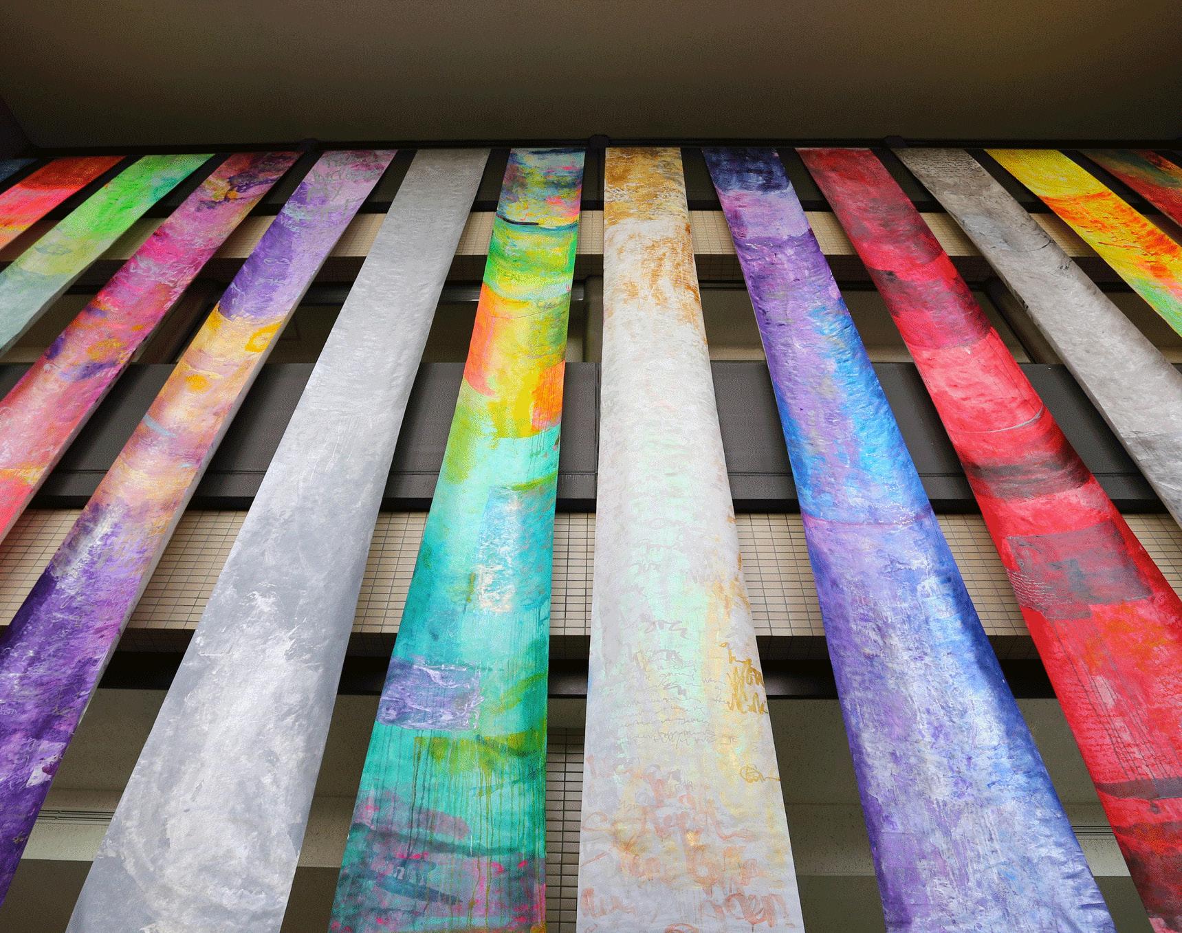 Hung in the MMAM atrium space 6, Tyvek scrolls create an entrance to the exhibition, guiding visitors into the galleries. Here we can see that the rich colors blend seamlessly into blue — the trees meandering down into the water. Created specifically for MMAM, these works reflect the local foliage of Minnesota and have a connection to Labovitz’s Tyvek scroll series that she has been creating for a number of years.