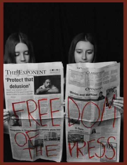 On the cover, Rhyan Colvin (9) and Brooke Cable (9) pose with newspapers in a muted tone to represent how Indiana University’s newspaper was recently censored in one of their issues this school year. The two students were in the journalism writing class, where they learned about the controversy behind censorship. The actual newspaper used in the picture is Purdue’s Exponent, who played an important and positive role in the story. Read more to find out.