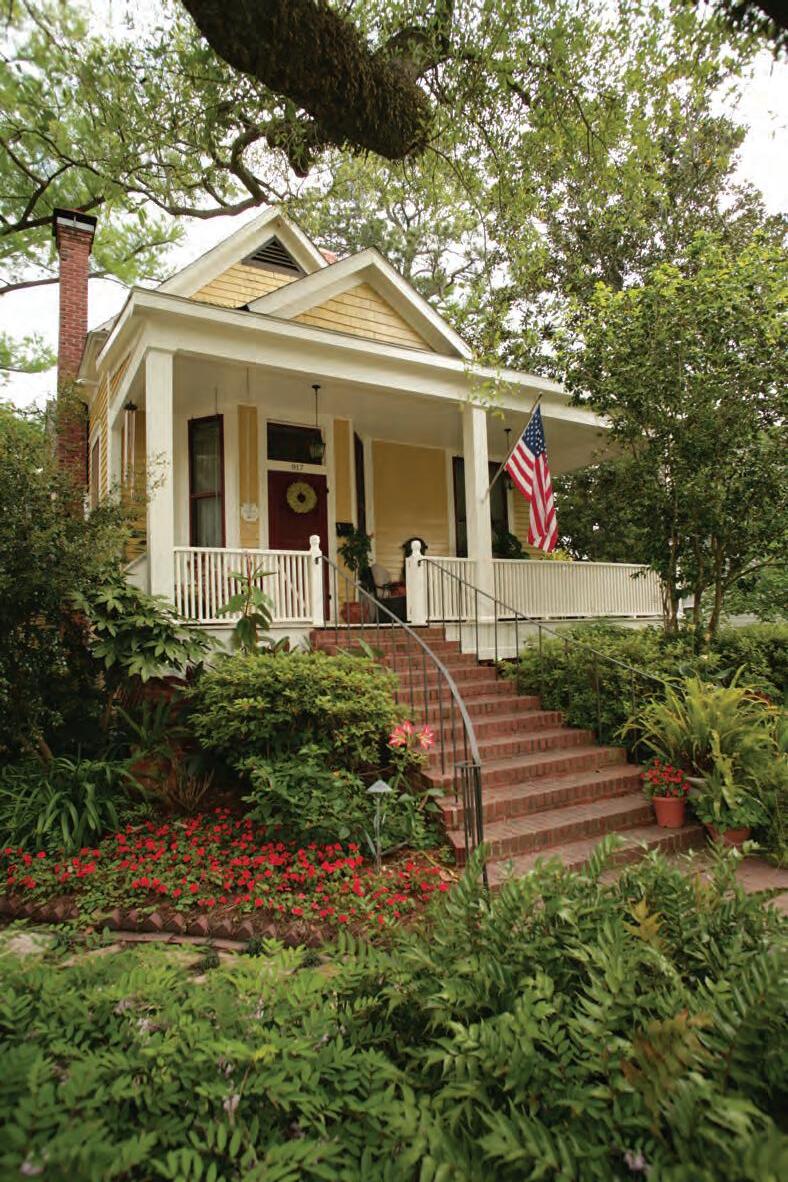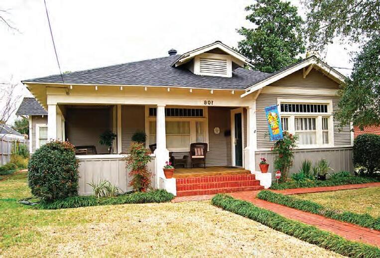 A sterling example of a craftsman airplane bungalow built of longleaf pine, brick and stucco. Five windows in the “cockpit” dormer and a broad front porch roof acting as the “wing.” A sleeping porch was added in 1920 over the porte cochere, and 360 pieces of polished, beveled, leaded glass make up the front door.