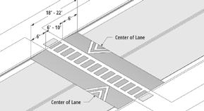 Rumble strips are patterned sections of rough pavement or topical applications of raised material, perpendicular to the direction of travel, that cause vibration and noise when driven over by the operator of a motor vehicle. This noise and vibration is intended to direct the motorist’s attention back to the roadway. FHWA-approved treatments include white- and black-painted stripes. Avoid conflicts with driveways. Typical spacing is 50 - 100 feet apart.