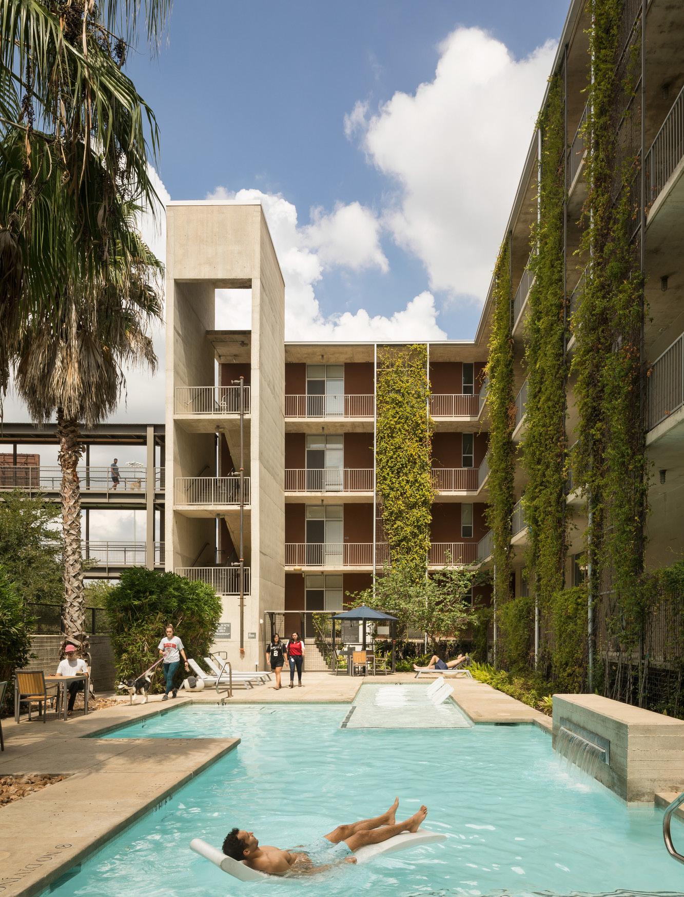 The connection to the five courtyards and to the outdoors creates both a unique oasis and urbane street presence. These courtyards link urban living with nature and provide outdoor activity and gathering spaces. All circulation is outdoors on single-loaded cantilevered walkways linked by bridges over Avenue B and alleys to the garage. This project was as much about subtraction as it was about adaptive reuse: where to cut holes in the concrete frame and where not to fill in voids to create unique courtyards.