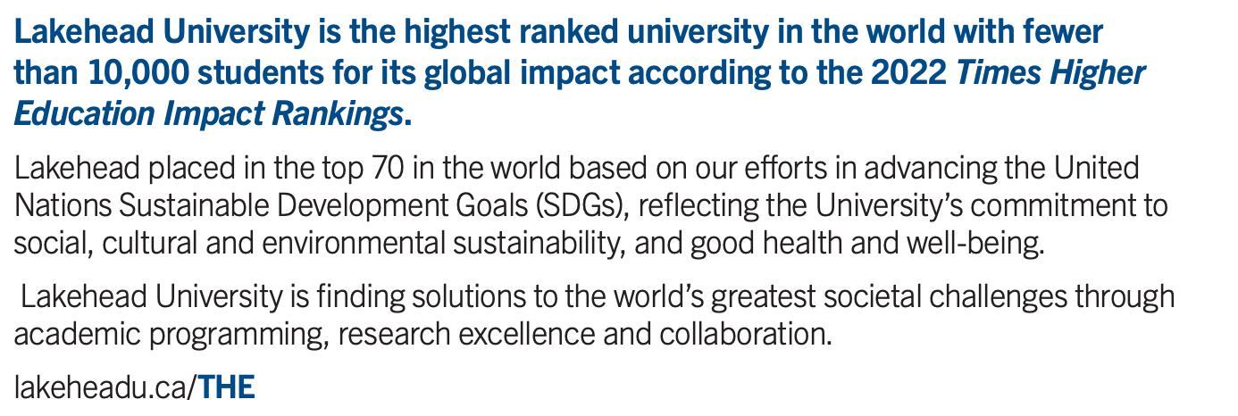 LAKEHEAD UNIVERSITY IS RANKED IN THE WORLD FOR GLOBAL IMPACT 64TH
