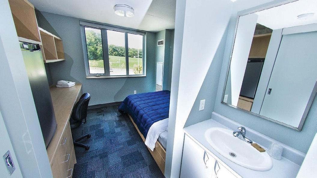Each student has a single room with a semi-private bathroom. Rooms are fully furnished with a bed, desk, desk chair, small fridge, and lots of closet space. The residence is divided into Houses of 40 students. Each House has a study room, lounge, and card-operated laundry facility. Residents have access to a workout room in the Residence building. A meal plan is included with the accommodation package.