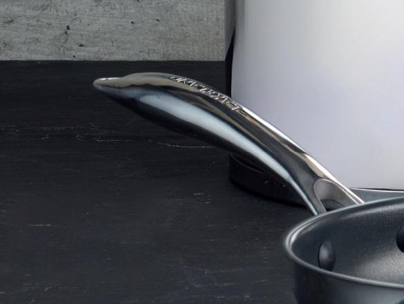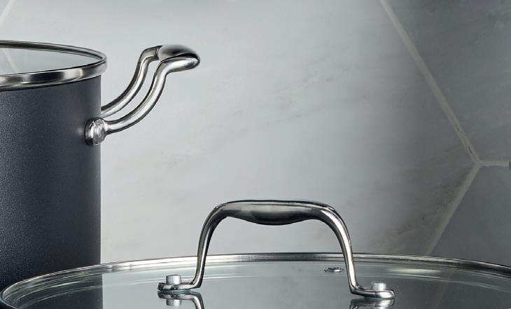 Designed with features to make every meal easier, these super strong, forged aluminium pans have pouring lips for straight-forward draining, silicone-rimmed lids to stop annoying rattles, and stay-cool silicone handles which give a comfortable grip. An iron powder coating has been added to the outside during a process called “arc spraying” to make them induction compatible and lighter than others with steel bases to do the same job.