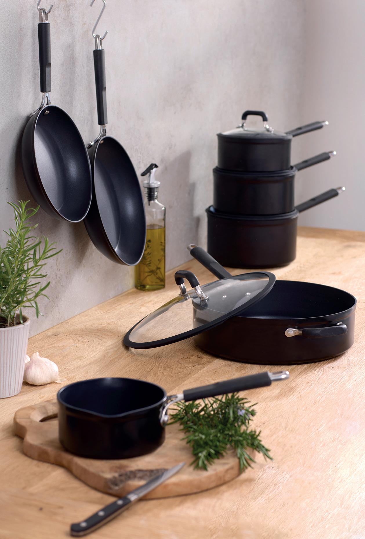 Includes three lidded saucepans (16cm, 18cm and 20cm) and two frying pans (20cm and 24cm).