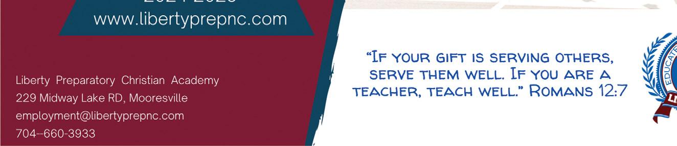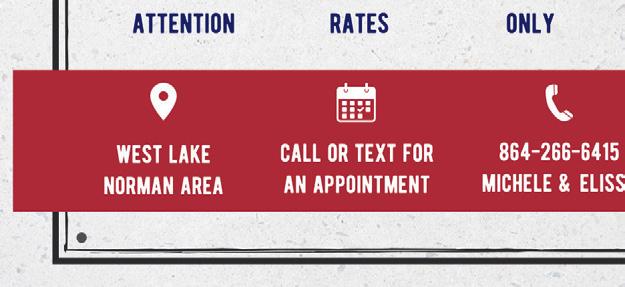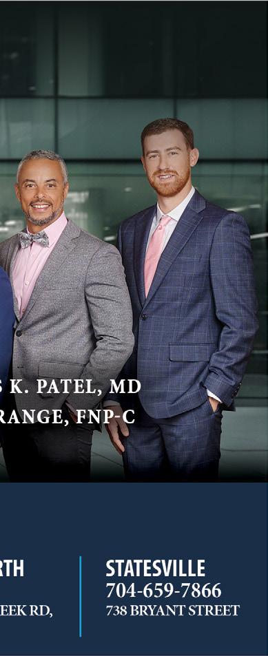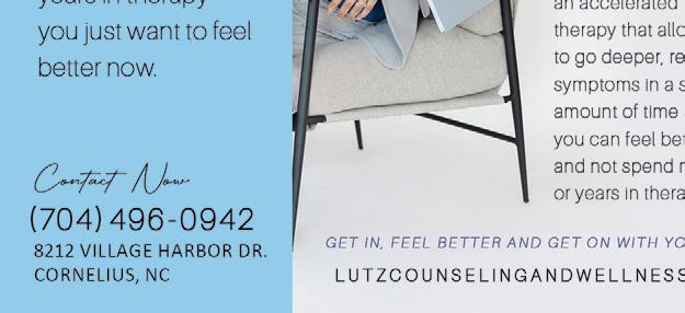 6 APRIL 2024 . lakenormanwoman.com Lake Norman Woman reserves the right to deny any advertisement or listing that does not meet Lake Norman Woman standards. Submissions are welcome but unsolicited materials are not guaranteed to be returned. Lake Norman Woman assumes no responsibility for information, products, services, or statements made by advertisers or editorial contributors. An advertised special printed in this publication is subject to change without notice. All rights reserved. Reproduction in whole or in part without written permission from the publisher is prohibited. AD SUBMISSIONS: ads@lakenormanwoman.com 704.895.6168 PO Box 1000, Cornelius, NC 28031
