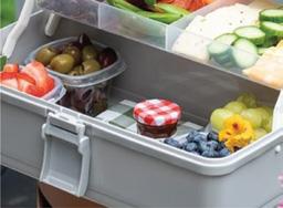 Just purchase a plastic tacklebox/toolbox and stack your snacks to your heart’s delight!