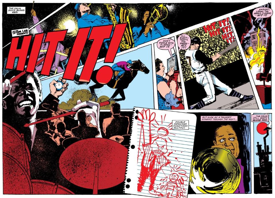 By Sienkiewicz’ time Sol Brodsky had been given the position of vice president, special projects (sadly, he died in 1984) and the arguments about gutters had ceased. Sienkiewicz’ amazing double page spread on pages 2 & 3 of that Moon Knight issue is stunning. The jazz band is depicted again with the drummer in the foreground. There is another childish drawing of an angry adult male and a small child. There are images of horseracing and baseball and a woman changing tv channels. And someone is told to Hit It! As he throws a plunger to demolish a building. And the design of all these elements is unique, all depicting different ways to Hit It!