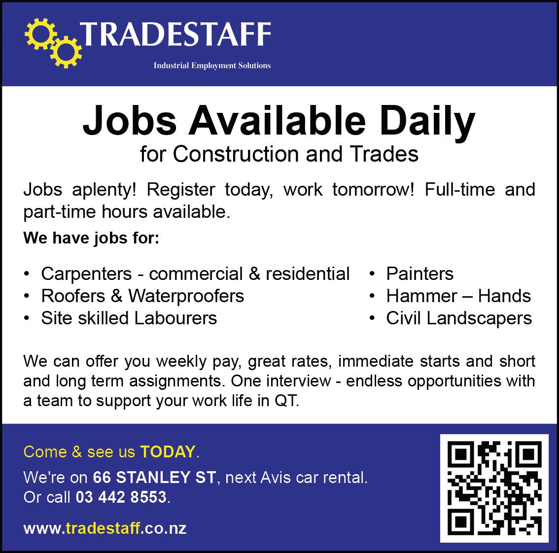 Queenstown Personnel and Labour Hire are looking for labourers for a variety of jobs around Queenstown with an immediate start. Contact Sharleen - 027 778 7377 or email sharleen@qtplabour.co.nz