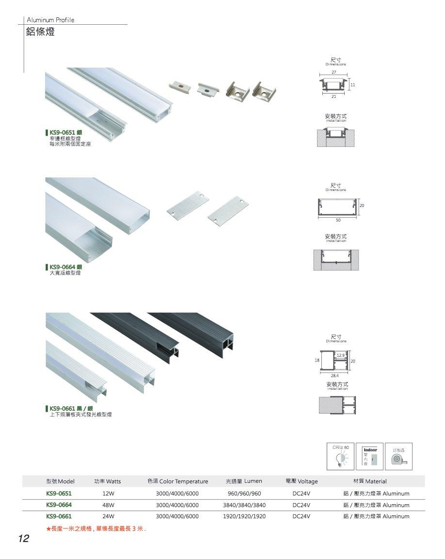 型號 功率 色溫 光通量 電壓 材質 Model Watts Color Temperature Lumen Voltage Material 12W+24W 3000/4000/6000 960/1920 100-240V 鋁製品 Aluminum 24W+48W 3000/4000/6000 1920/3840 100-240V 鋁製品 Aluminum 24