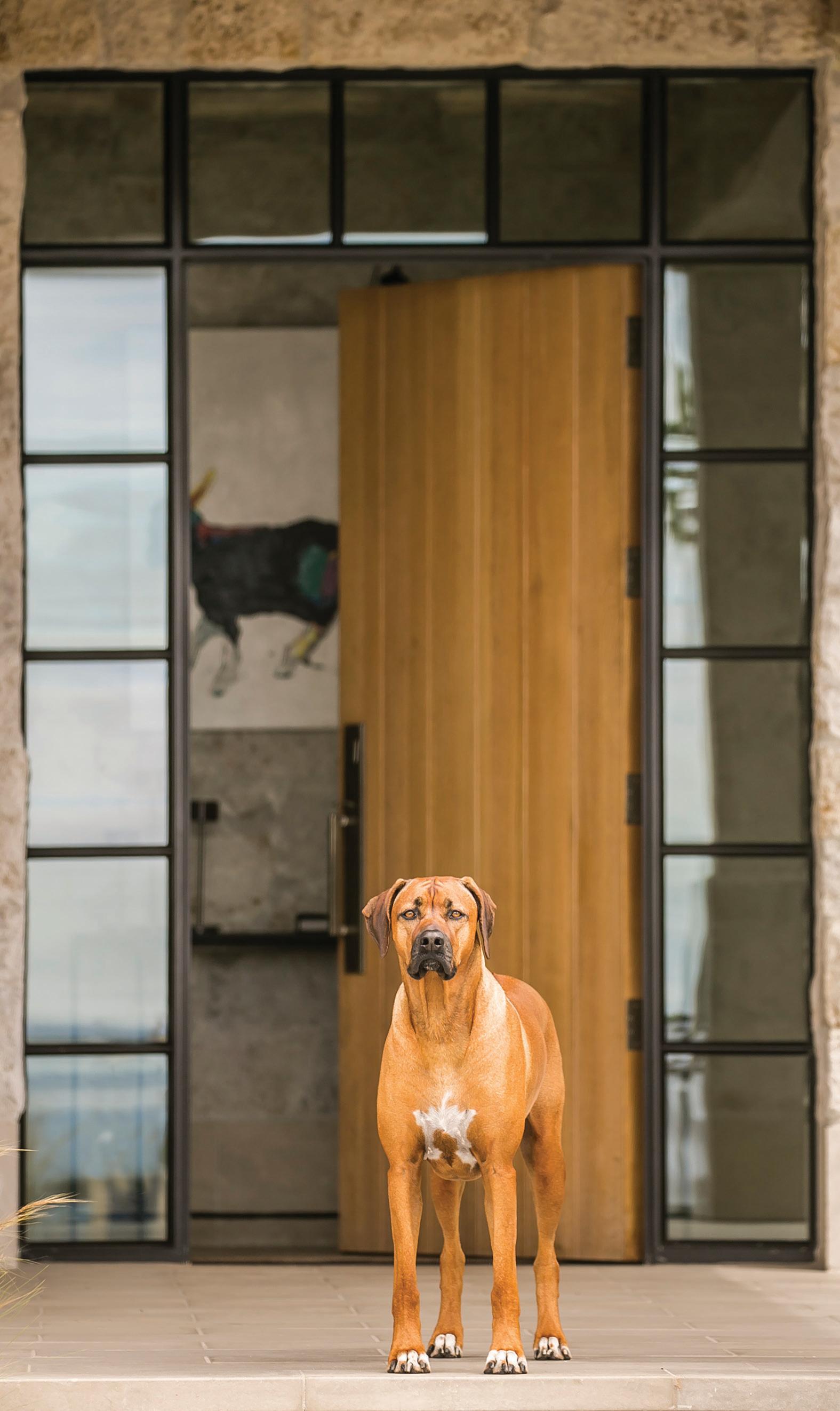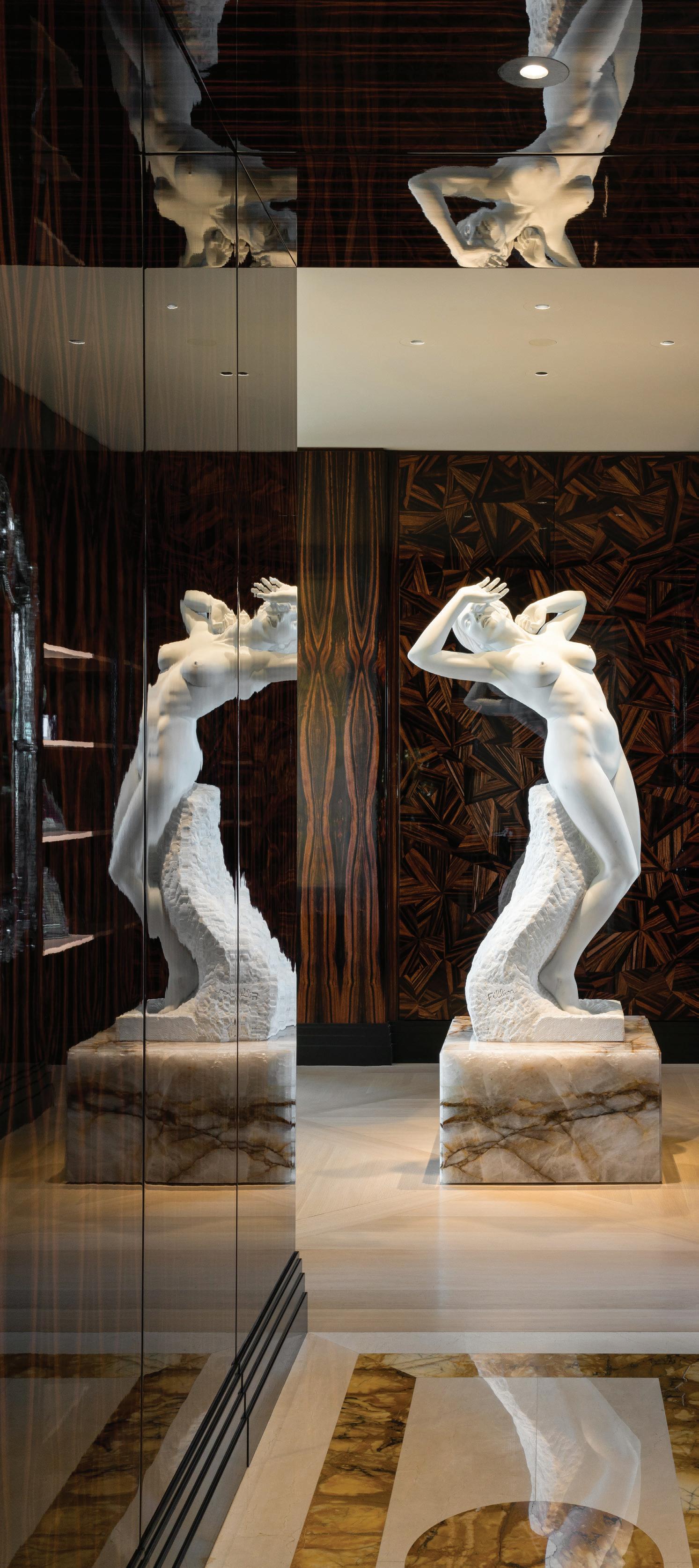 Artwork: plinth (entry) - D & J Custom Benchworks, Los Angeles; plinth (living room) - Stone Art and Allaire Inc., Scottsdale, AZ; sculpture - client’s own, Emmanuel Fillion