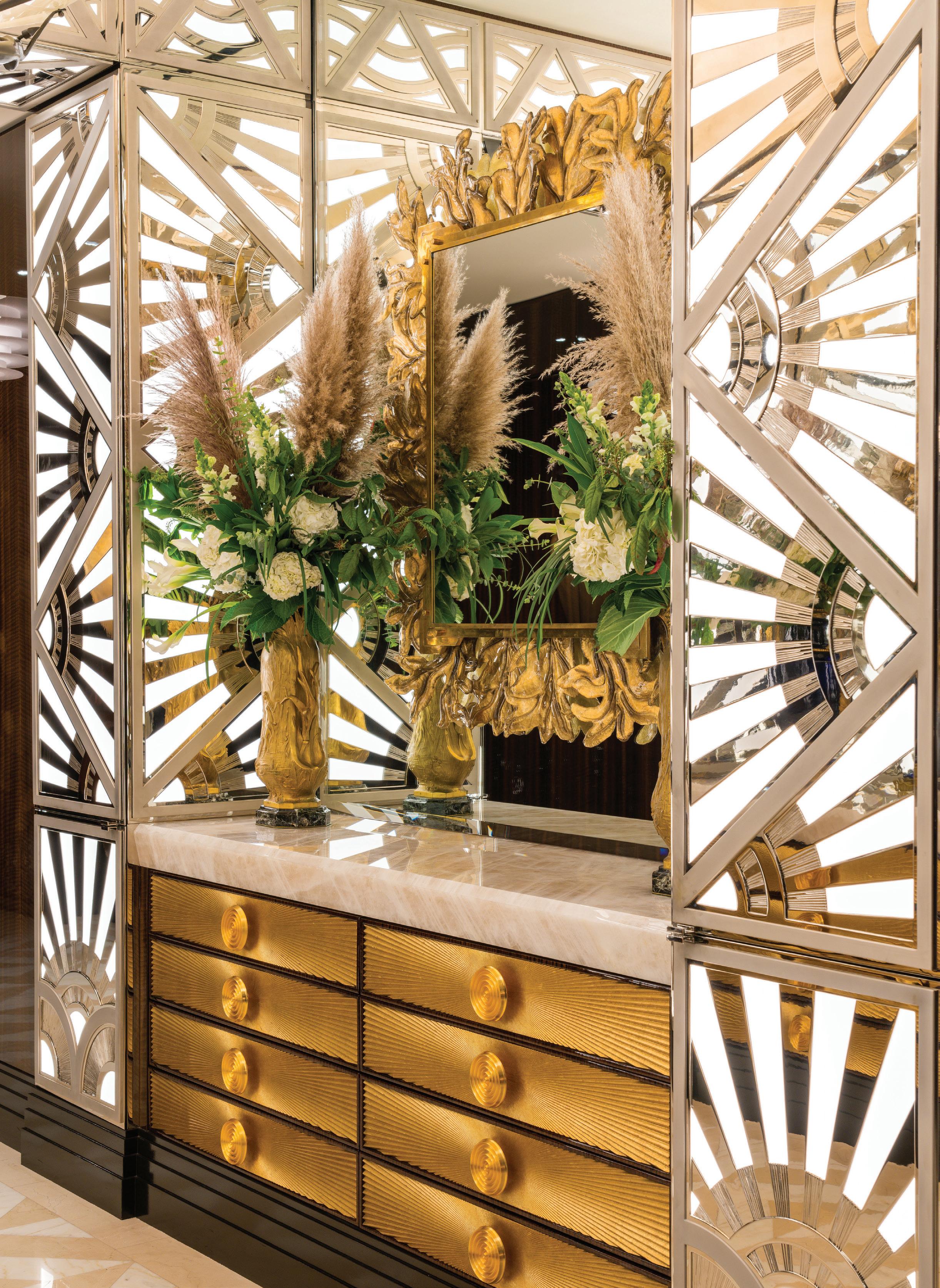 Furniture: Gran Louis XVI fauteuils, slant edge sectionals, Josephine curved sofa, Eve swivel lounge chairs - J. Robert Scott, Los Angeles; cocktail table - Allaire Inc., Scottsdale, AZ; panels - polychrome, partial-gilt mosaic, Bernd Goeckler, New York, NY