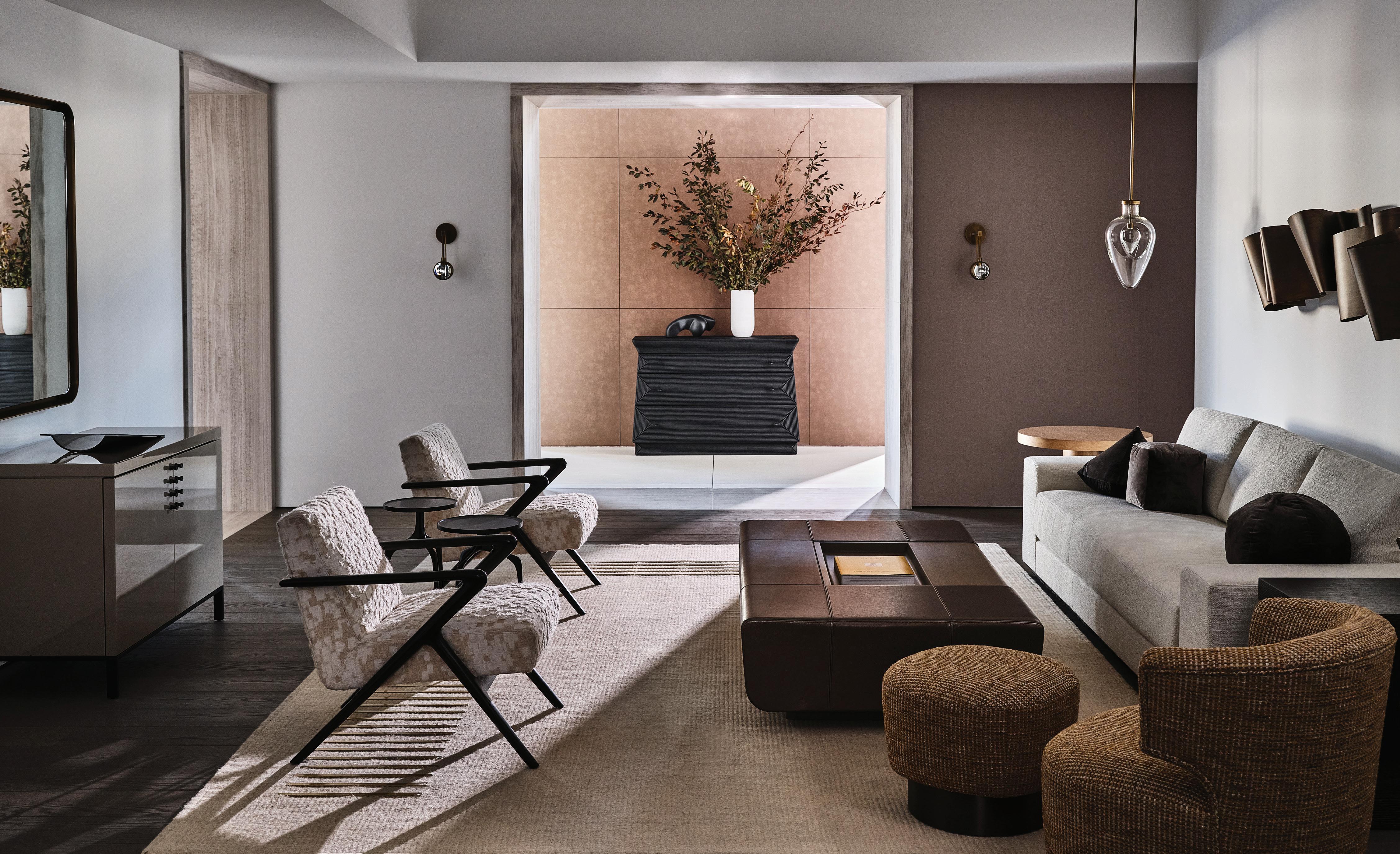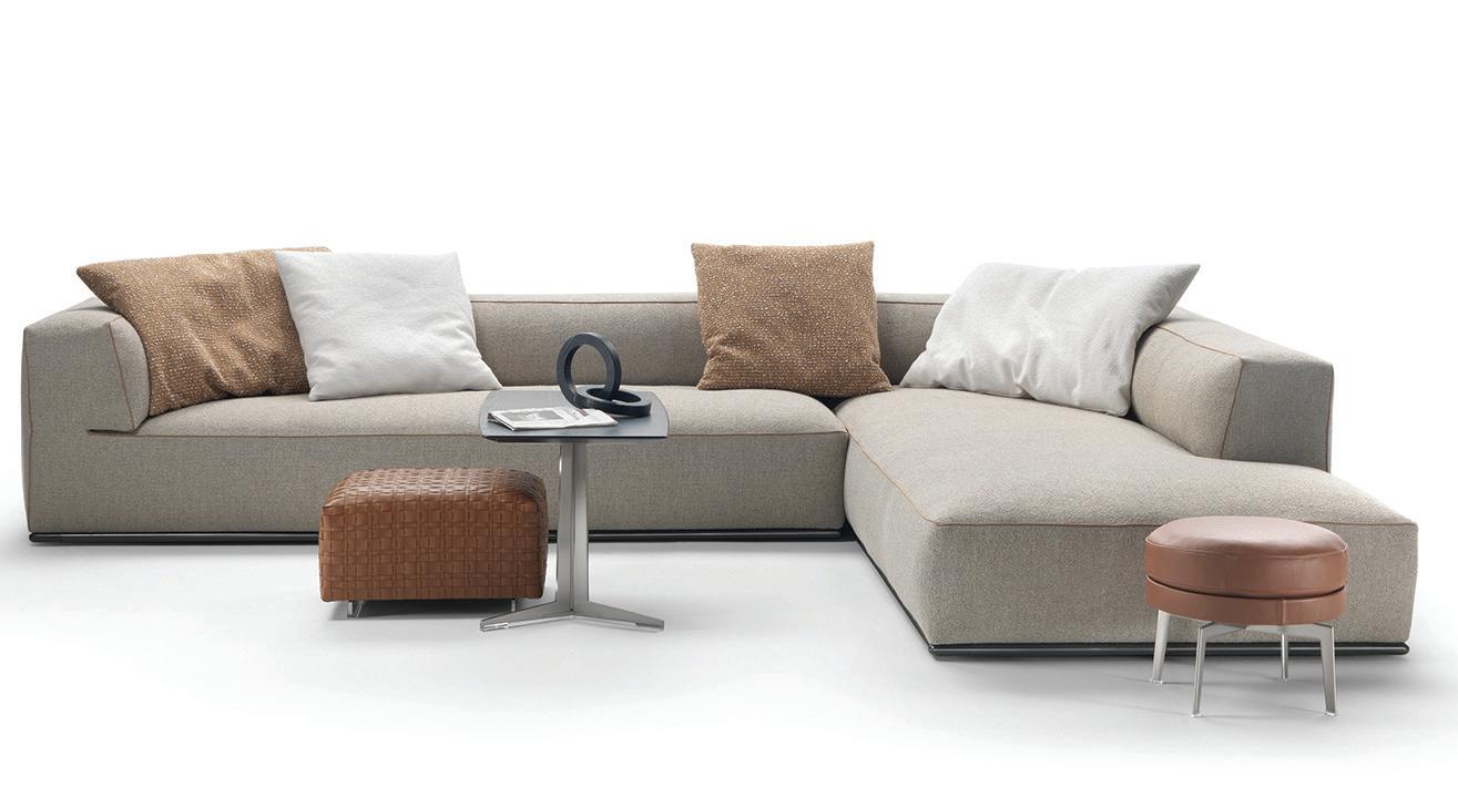 Composed of understated upholstered pieces that can be combined in various ways, the modular Perry seating system heralds a new way of designing living spaces, creating original arrangements that lend to a more dynamic flow and a more casual look. Soft shapes, generously padded in goose down, calibrated proportions, sophisticated tailoring details, like the piping that outlines the silhouette of the upholstered pieces, are some of the distinctive features of the unconventional design.