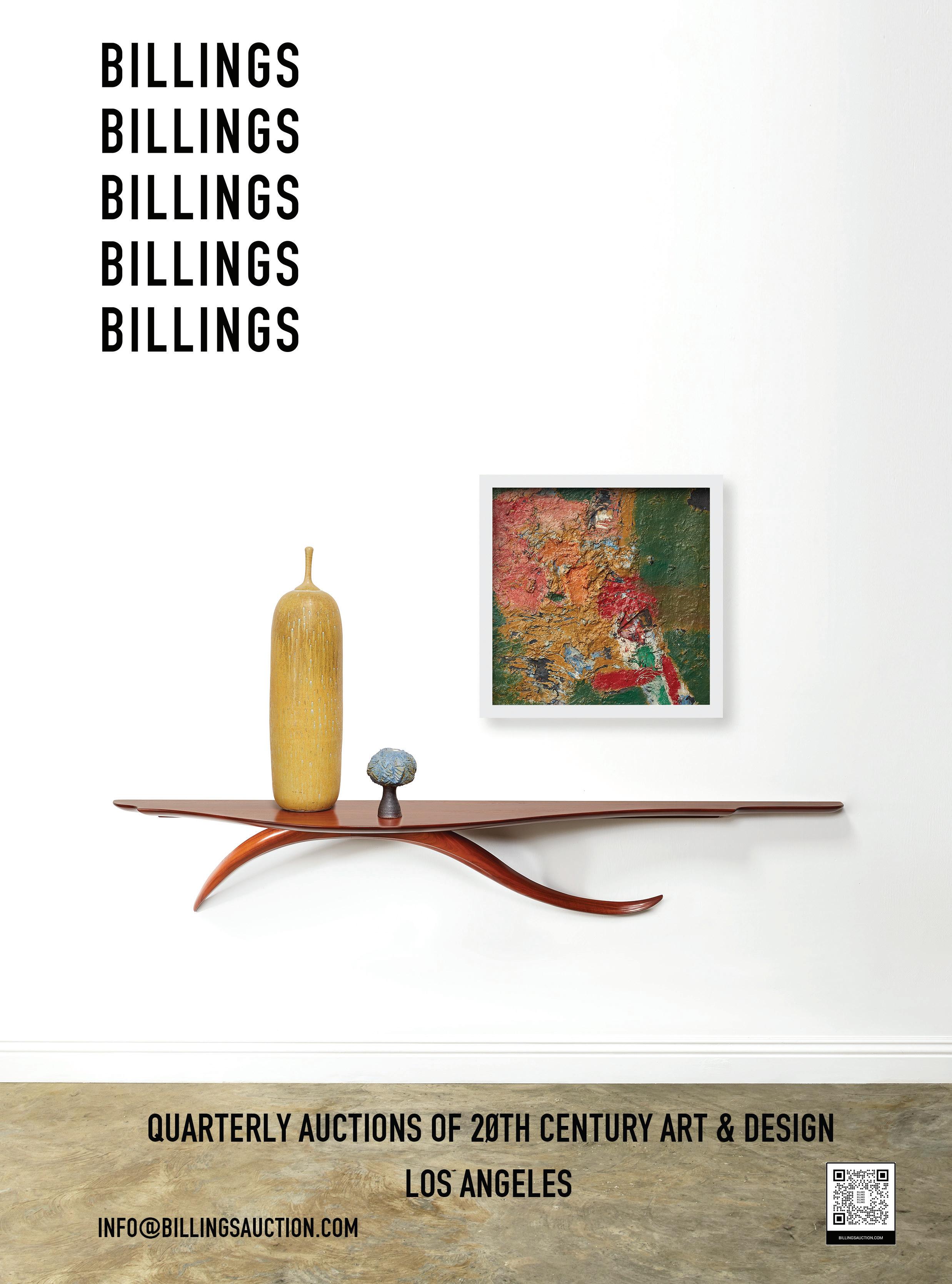 BILLINGS offers live in-house auctions of modern art and design at its brick-and-mortar space in the heart of downtown L.A.’s Arts District. Representing a wide range of American and international art and design, its catalog is often heavily weighted in mid-century modern selections with offerings from the 1960s through the early 2000s. Those unable to attend in person can bid online by registering at liveauctioneers.com.
