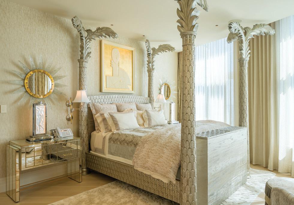 Aside from her cloudlike bedroom suite, designed almost as a self-contained flat, there are two whimsical guest bedrooms. A portrait of a dog in Elizabethan dress by Czech artist Zdeněk Šorf presides over one, while the other boasts a four-poster bed that once belonged to Cher, its posts carved to resemble palm trees. “This client loves interesting things and the stories behind them,” says the designer. Outside (just because you’re nearly 500 feet up doesn’t mean you can’t have a garden), terraces that run the length of both sides of the penthouse were planted with olive trees and agaves by landscape designer Scott Shrader.