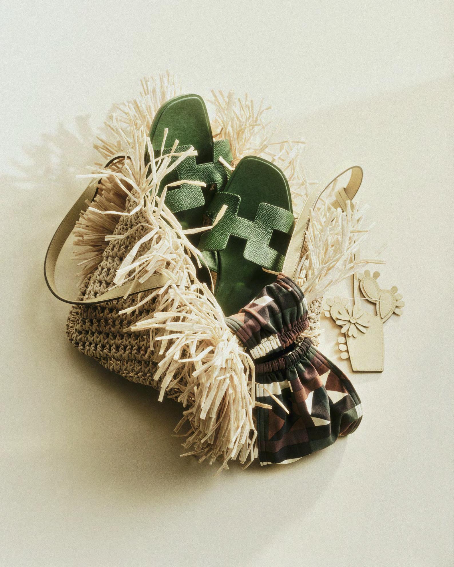 Clockwise from left: Oscar de la Renta crochet raffia square tote bag, $1,490, net-a-porter.com; Hermès Oran sandals, $760, hermes.com; Eres Zoom bandeau, $425, eresparis.com