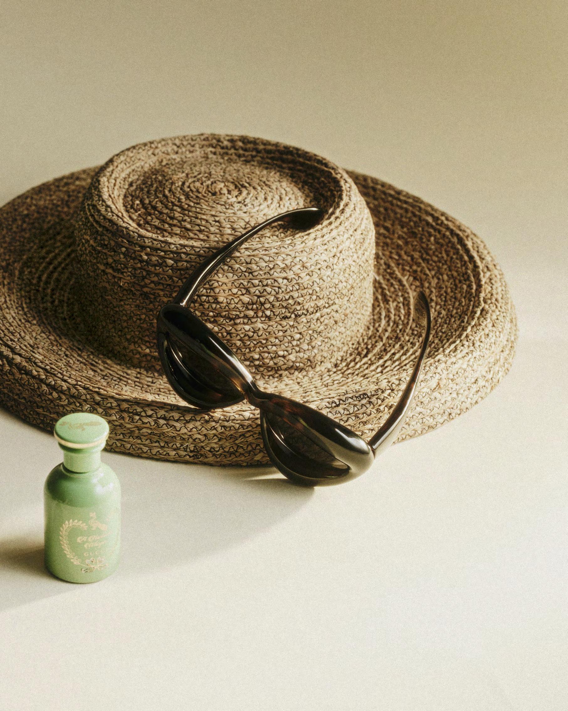 Kokin New York Hats Zigzag Luncheon hat, $595, 212.671.0238, kokininc@icloud.com; Loewe round-frame tortoiseshell sunglasses, $360, mrporter.com; Gucci A Nocturnal Whisper perfumed oil, $480/20 ml, gucci.com Set design by