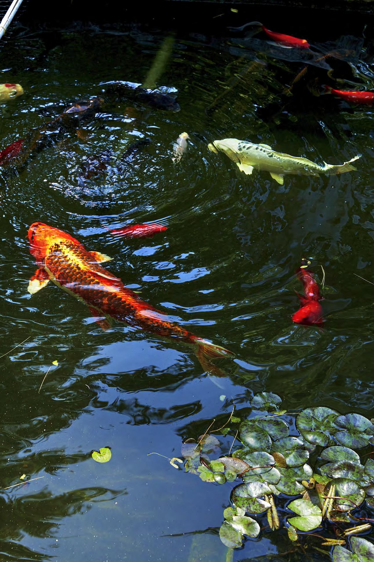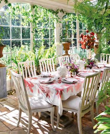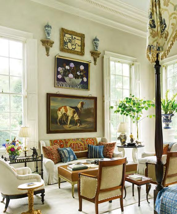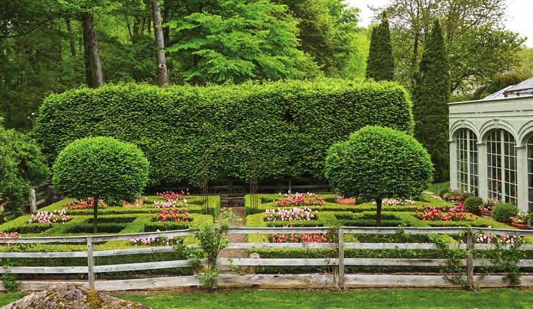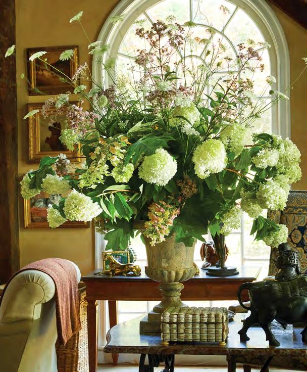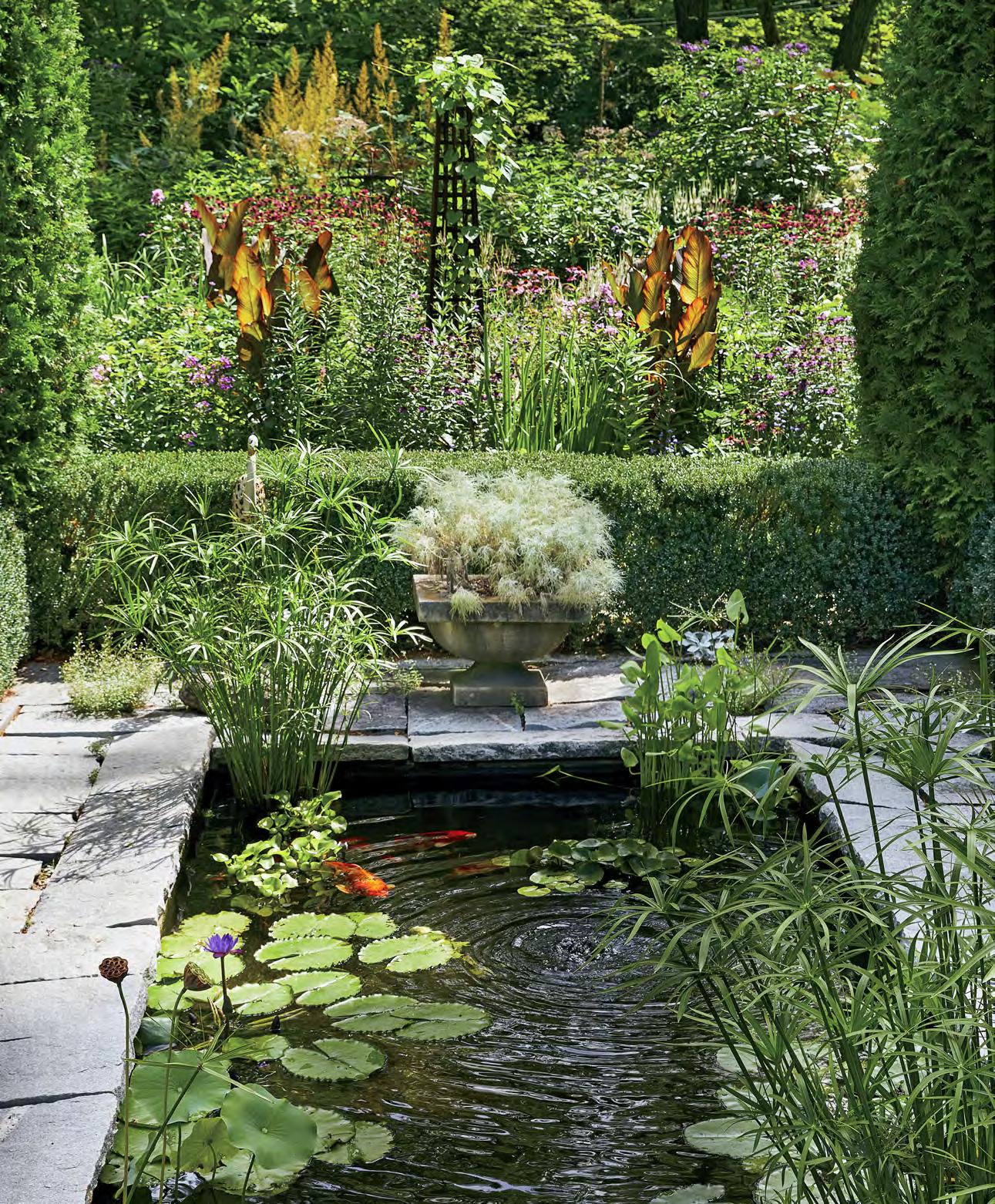 Scenes from Bunny’s gardens and gardeninfluenced rooms in her Connecticut country house. Previous spread: The koi pond in the sunken garden