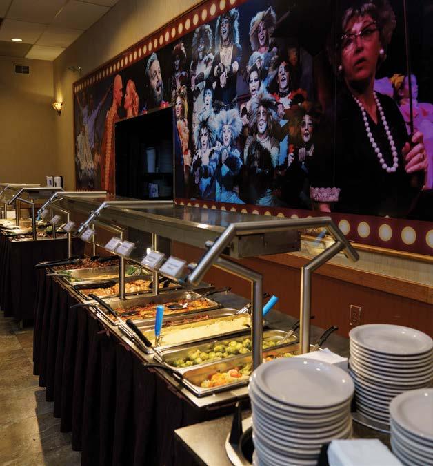 REGARDING THE MENU, options exist. On Sunday through Wednesday evenings and all matinees, the buffet features an assortment of salads and a variety of tasty hot entrées complete with potato and vegetable side dishes. Dutch Apple’s signature desserts are also included. On Friday and Saturday evenings, the buffet is augmented with a prime rib carving station.