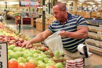 Cindy Miller bottles Golden Guernsey milk at Yoder’s Country Market. Whole milk must be a minimum of 3.25% milk fat by weight, and skim milk is set at .5% milk fat. Labels are applied to plastic milk jugs by hand. Milk is available in glass bottles.