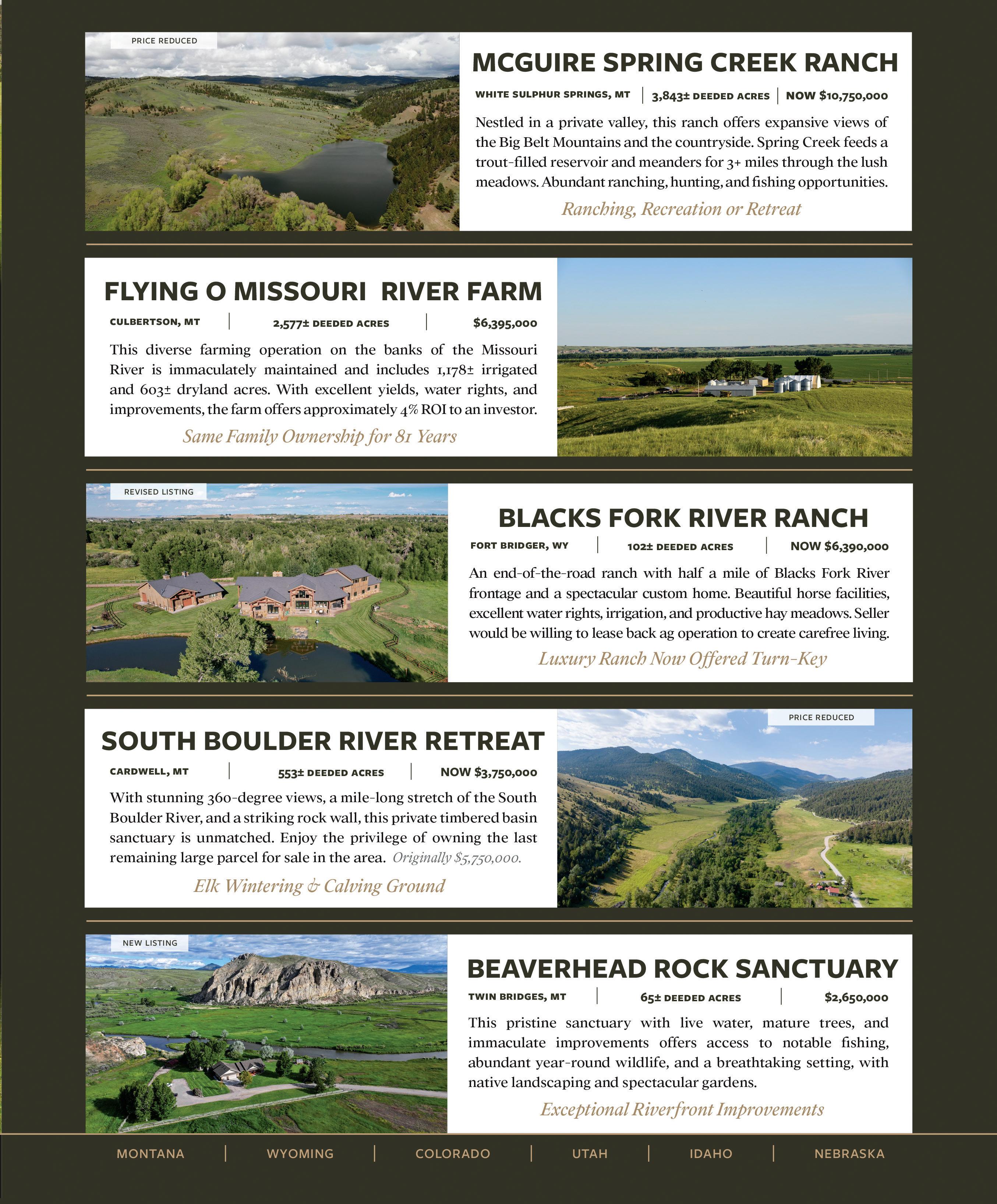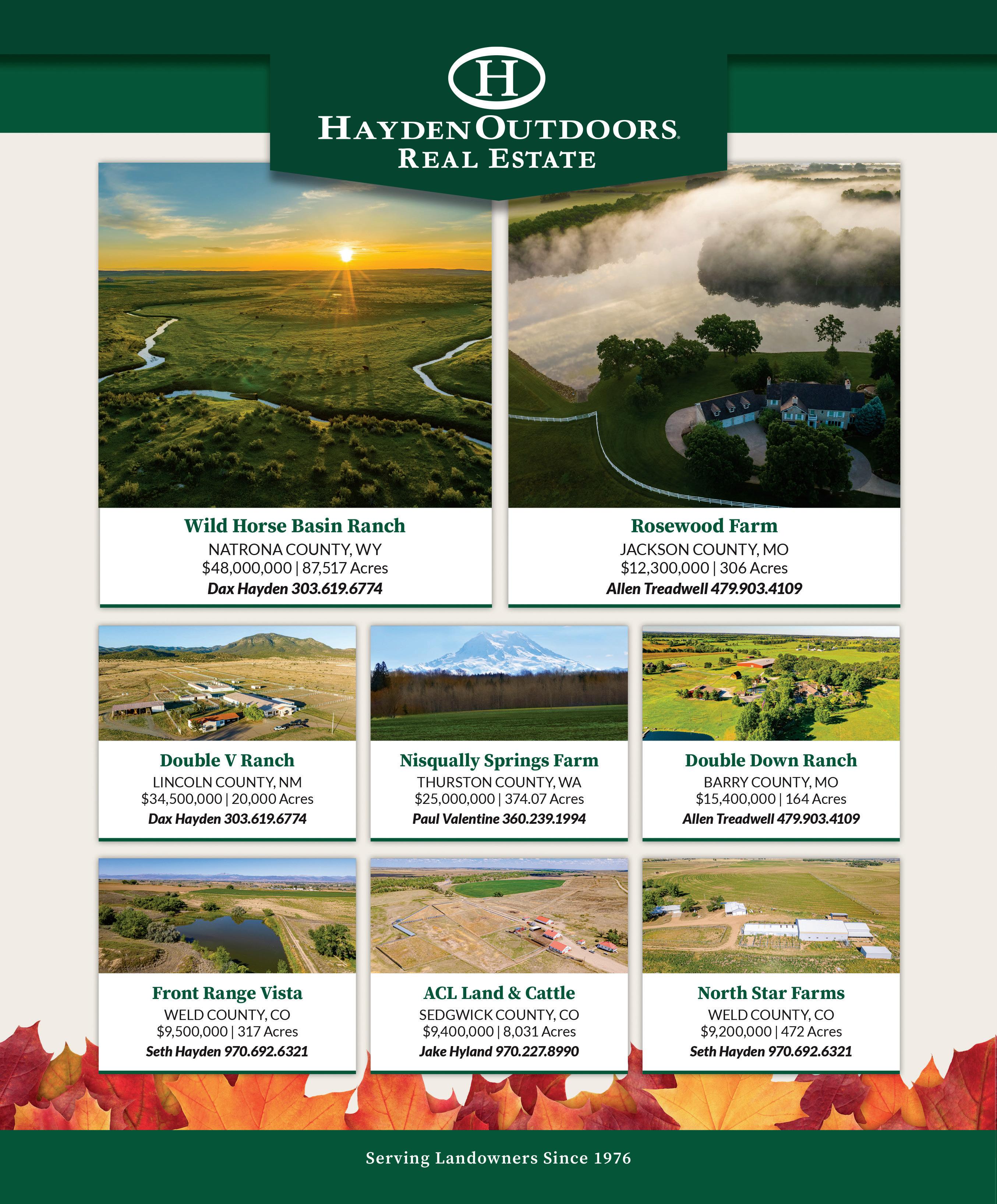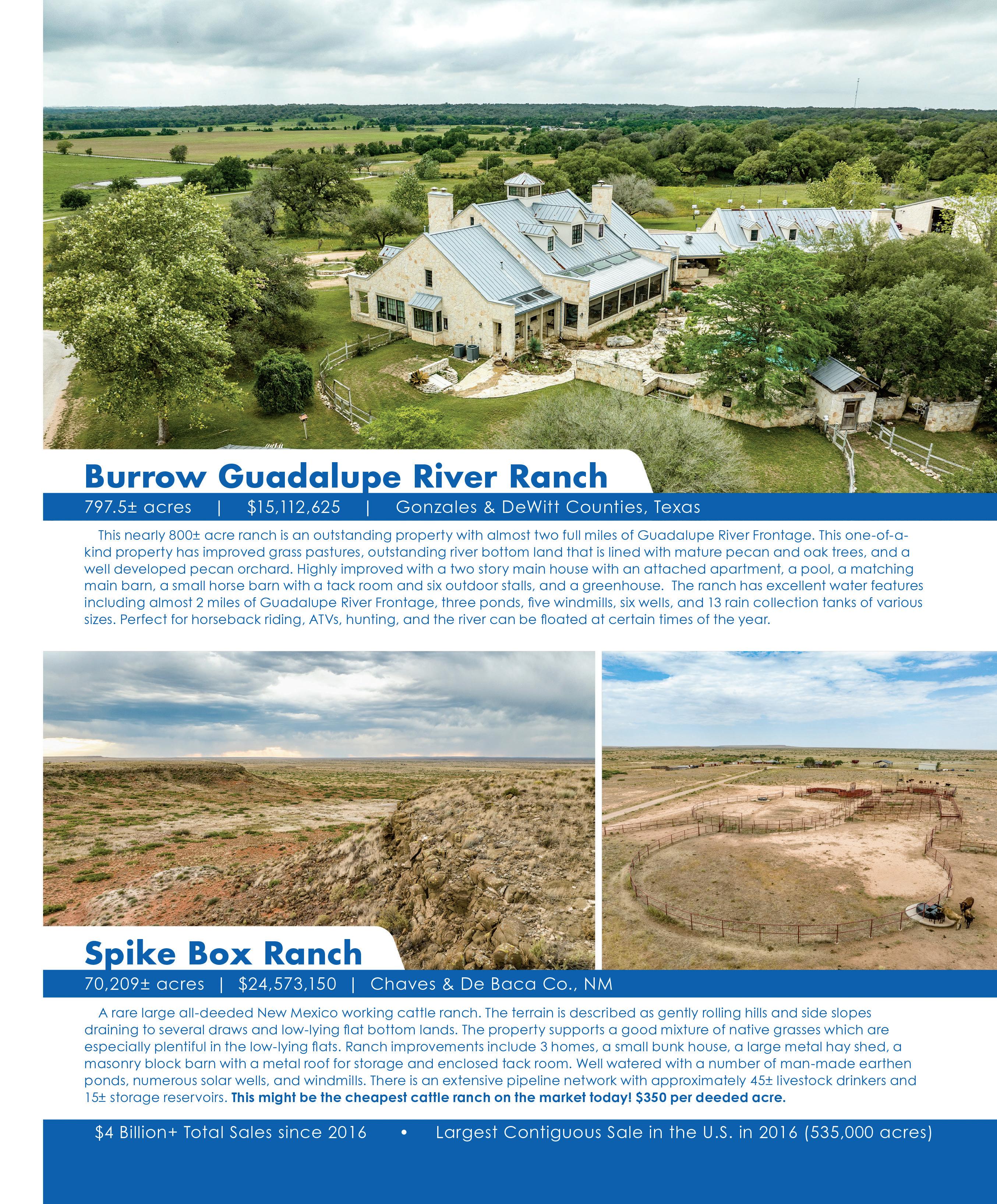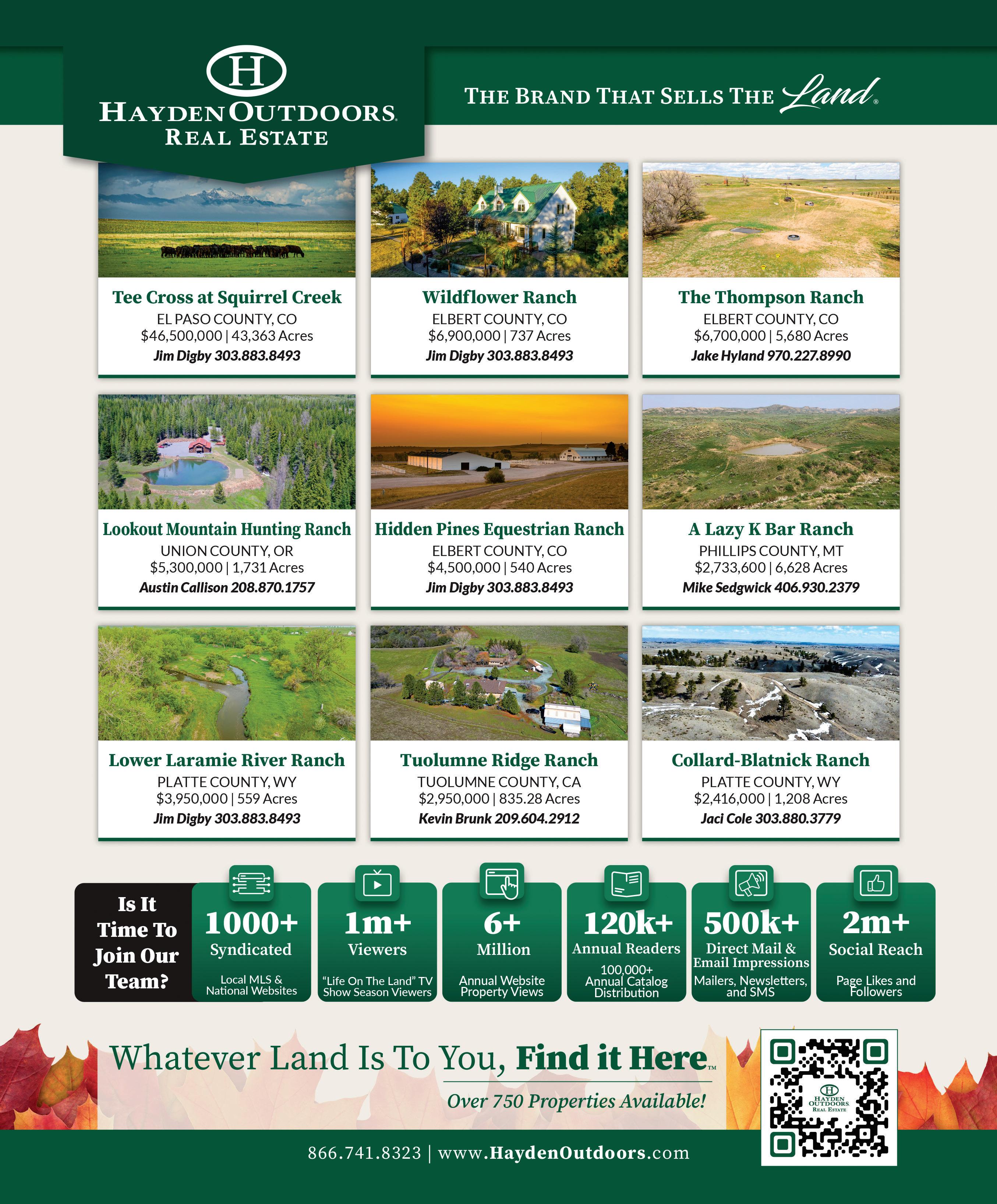 Ag Lands Southwest 109 American Farm + Ranch 84 Arrowhead Land Co 42 Bachman & Associates 84, 98 Beaverhead Ranch Group 52, 103 C3 Real Estate Solutions 104 California Outdoor Properties 40, 92 Cascade Sotheby’s International Realty | Brook Havens 102 Century 21 Farm & Ranch Harvey Properties 84 Chas. S. Middleton and Son LLC 32, 76 Clark Company Ranch Real Estate 96 Coldwell Banker Baine 106 Deitra Robertson Real Estate, Inc. 84 Eagle Land Brokerage 84 Fridrich & Clark Realty LLC 48, 107 Harrigan Land Company 46, 100 Hayden Outdoors Real Estate 24, 34, 44, 50, 56, 80 Heyn Real Estate 84 Hood Real Estate Inc. 8 Icon Global Cover, 10, 20 International Sporting Properties 84 Jacobs Properties 84 Keller Williams Black Hills | Lewis Realty 36, 94 Land Investex LLC 101 M4 Ranch Group 58, 86 Mason Morse Ranch Company LLC 83 Mirr Ranch Group 90 Northwest First Realtor 84 O’Neill Land LLC 112 Peoples Company Back Cover Powell Land Resources LLC 84 Properties West Realty LLC 28, 54 RE/MAX Advantage Land Division 84 Republic Ranches LLC 7 Results Land Co. 84 Swan Land Company 88 Taylor Land Investments 84 Texas Ranch Brokers 84 Texas Landmen 38 The Whitney Land Company. 84 Twin Oaks Realty 112 United Country Ranch Properties | Northwest Realty & Auction 110 United Country Real Estate 111 Warrior Earth 19 Western Ranch Brokers 3, 108 Wilks Ranch Brokers 105