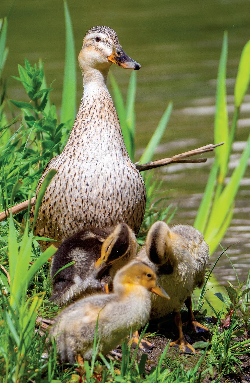 After they hatch, the ducklings will spend 24 hours to 48 hours on the nest. Then, the hen will lead them to a wetland and she will watch over them while they feed. Hopefully, the wetland is rich in aquatic insects and invertebrates because that’s what the ducklings need to thrive. It takes about 58 days before they’re able to fly, so the ducklings are especially vulnerable to predators during that period. Staying on the water with access to dense vegetation is the key to duckling survival.