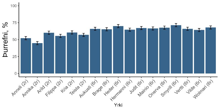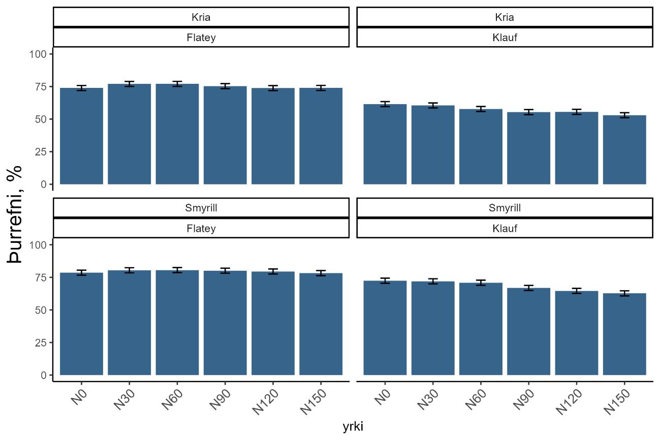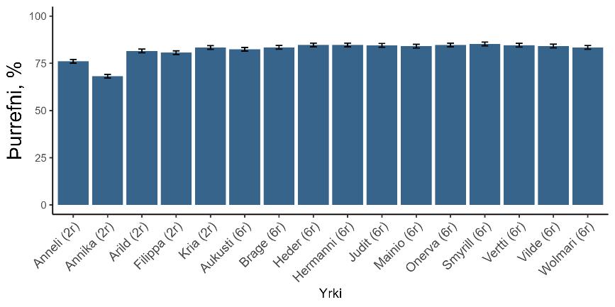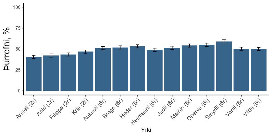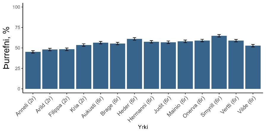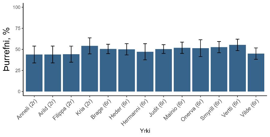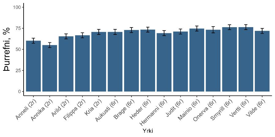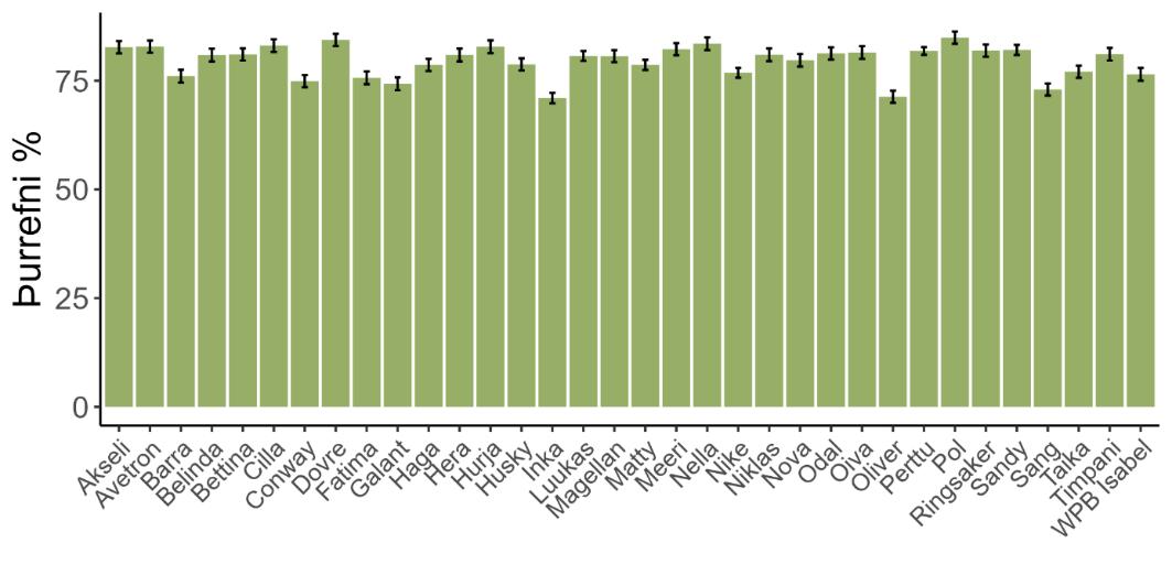 Þurrefnishlutfall í tilrauninni mældist á bilinu 66-86% (Mynd 6). Flest yrkin voru um og yfir 80% þurrefni en tvíraða yrkin Anneli og Annika voru með áberandi lægra þurrefni. Smyrill skilaði að meðaltali hæsta þurrefninu af sexraða yrkjunum (85,3%) og Kría hæsta af tvíraða yrkjunum (83,4%).