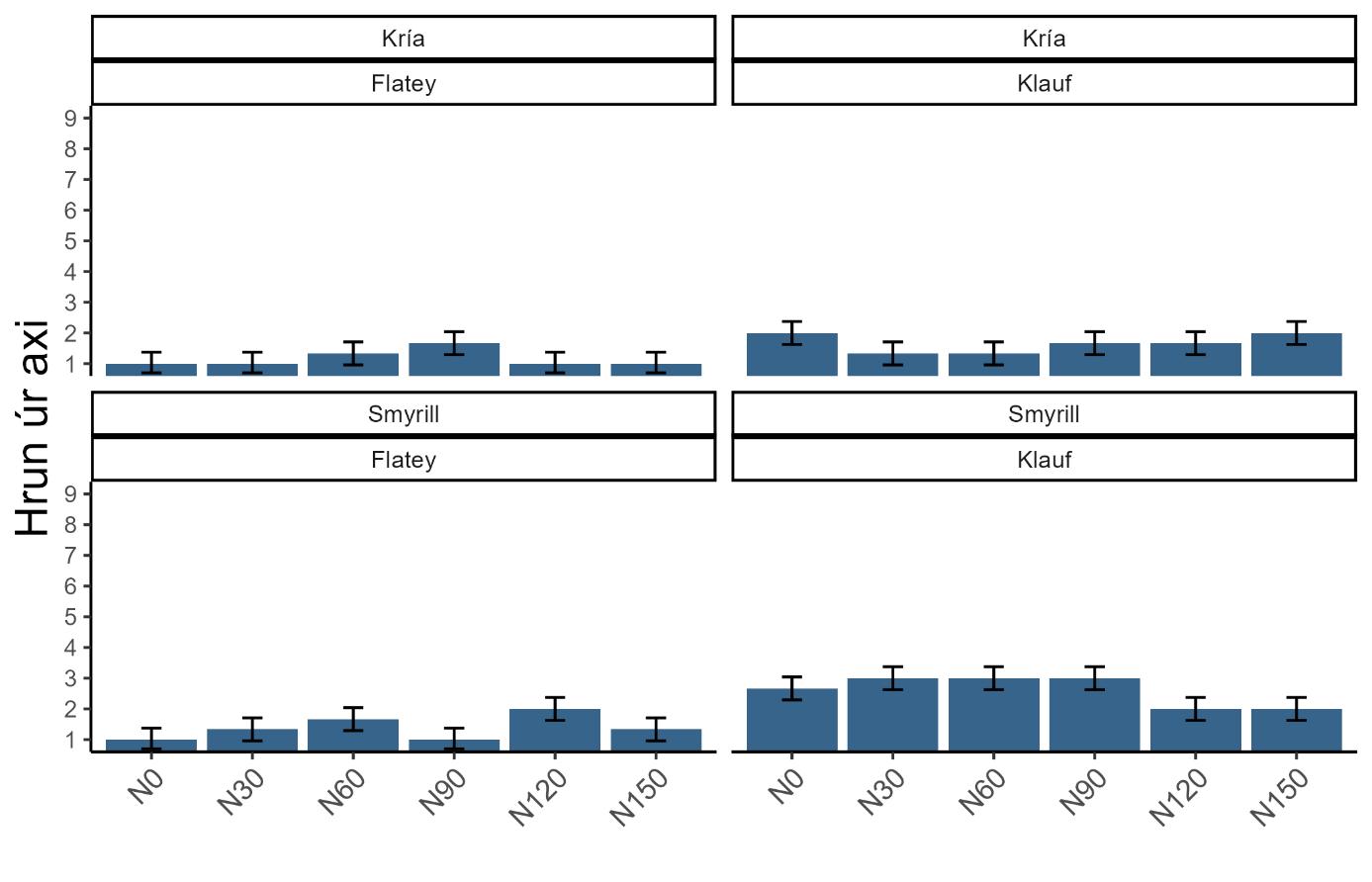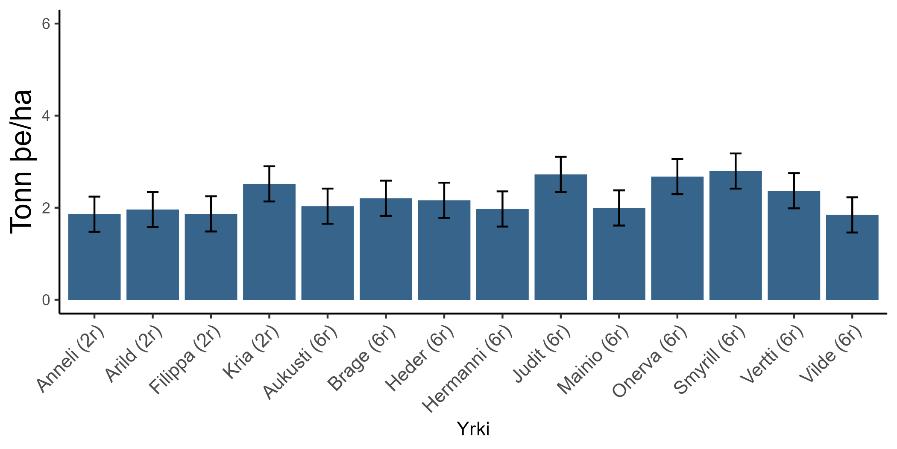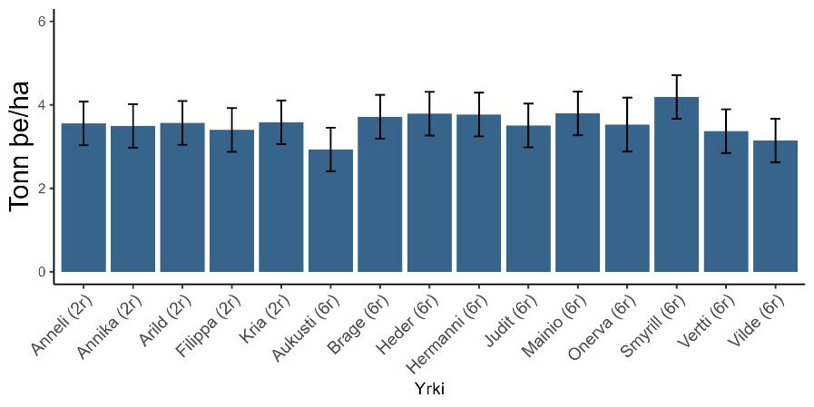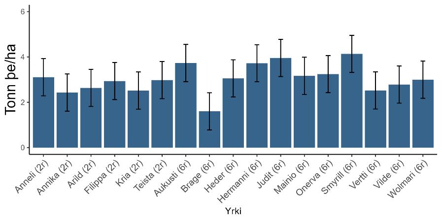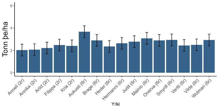 Uppskera í tilrauninni mældist á bilinu 1,9-4,5 tonn þe/ha en ómarktækur munur var á milli yrkja (Mynd 3). Smyrill skilaði að meðaltali mestri uppskeru (4,2 tonn þe/ha) af sexraða yrkjunum og Kría mestri af tvíraða yrkjunum (3,6 tonn þe/ha). Aukusti skilaði minnstri uppskeru (2,8 tonn þe/ha) og hugsanlega er það vegna mikils hruns úr axi.