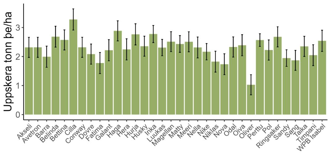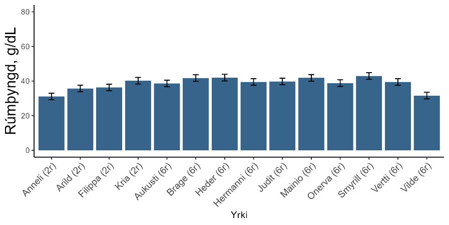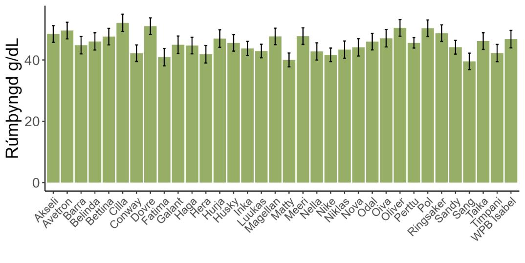 Töluverður breytileiki var í uppskerunni (Mynd 38), sem var á bilinu 0,9-3,2 tonn þe/ha. Þar sem Oliver hafði minnstu uppskeruna (0,9 tonn þe/ha) og Cilla var uppskerumest (3,4 tonn þe/ha). Rúmþyngdin mældist á bilinu 39,9-52,2 g/dL, þar sem sænska yrkið Dovre mældist með mestu rúmþyngdina (53,7 g/dL) og Matty með minnstu (38,6 g/dL) (Mynd 39).