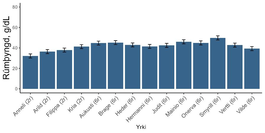 Rúmþyngd mældist á bilinu 38-62 g/dL (Mynd 8). Vertti var með mestu rúmþyngdina af sexraða yrkjunum (57,6 g/dL) að meðaltali en Smyrill var skammt á eftir (57,0 g/dL). Anneli og Annika voru með áberandi lægstu rúmþyngdina af tvíraða yrkjunum (43,8 og 37,6 g/dL) en Kría með mestu rúmþyngdina (55,4 g/dL)