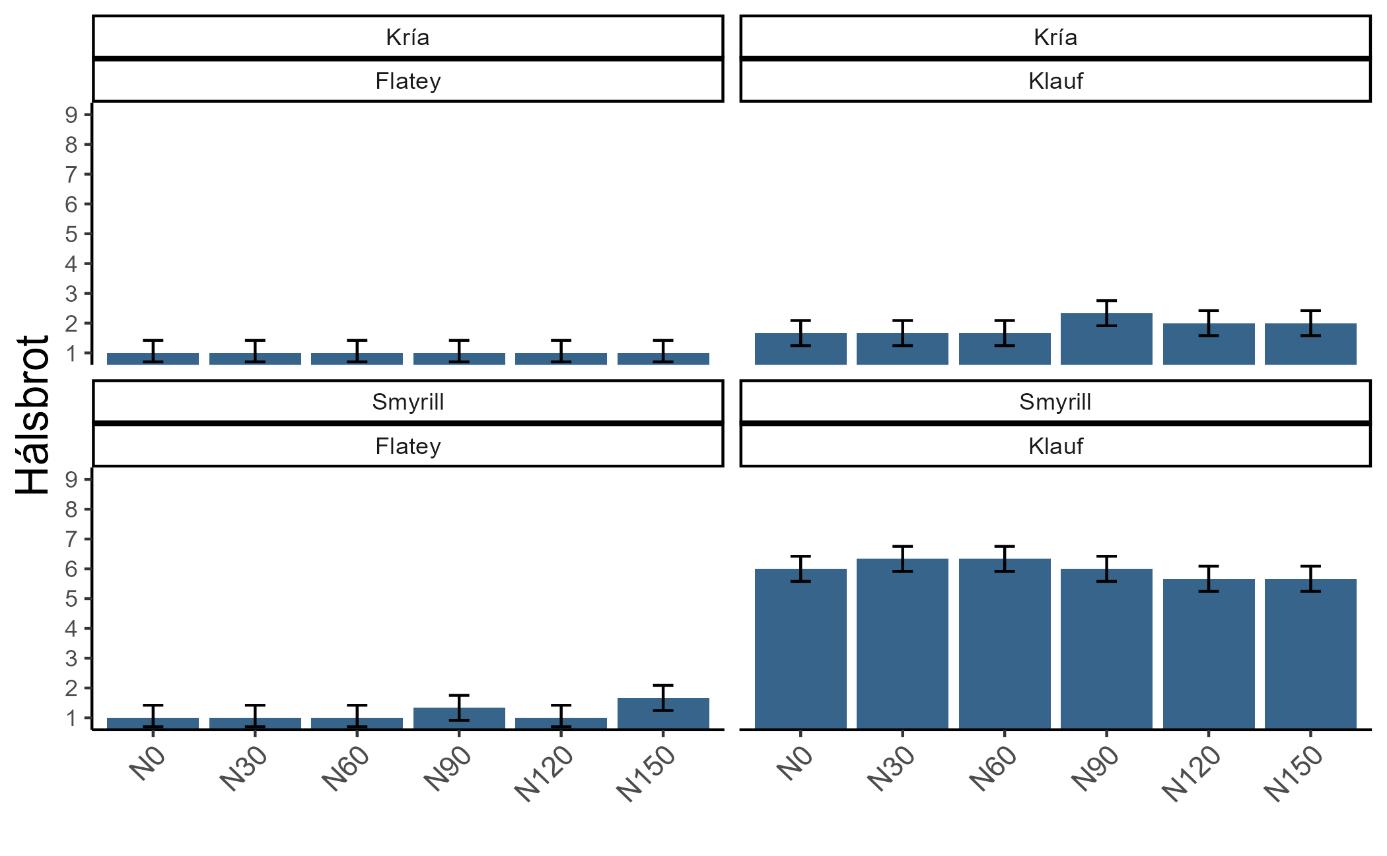 Nokkur lega var í flestum reitum þar sem sexraða yrkin lágu áberandi mest. Einnig var mikið brot í mörgum reitum en afar lítið um hrun úr axi.