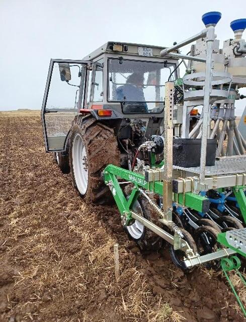 Tilraunin var lögð út á melajarðvegi sem var plægður árið 2023 en farið yfir með pinnatætara vorið 2024. Vegna bleytu festist vélin (Mynd 9) og þurfti frá að hörfa við sáningar, endaði með að sáðdagar urðu þrír; 5. maí, 9. maí og 17. maí. Áburður var felldur niður með fræinu, sem samsvarar 500 kg/ha (80 kg N, 33 kg P og 50 kg K) af 16-15-12 áburði frá Skeljungi.