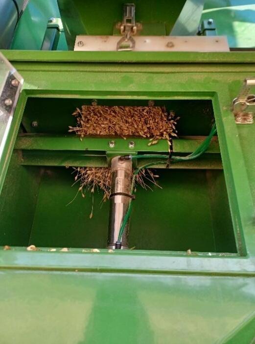 Tilraunin var að hluta skorin upp þann 30. september 2024. Lítið sem ekkert var um hrun og legu í reitum. Örlítið var um brot, þar sem sexraða yrkin voru meira brotin. Óþroskað korn olli stíflum í reitaþreskivélinni (Mynd 10) og því eru uppskerutölurnar ómarktækar og engar uppskeruniðurstöður birtar. Öllum brögðum var beitt til þess að leysa þann vanda en að lokum var tekin sú ákvörðun að tilraunin teldist óþreskihæf. Sýni fengust úr 30 reitum af 90.