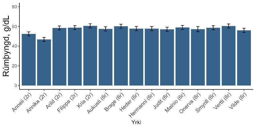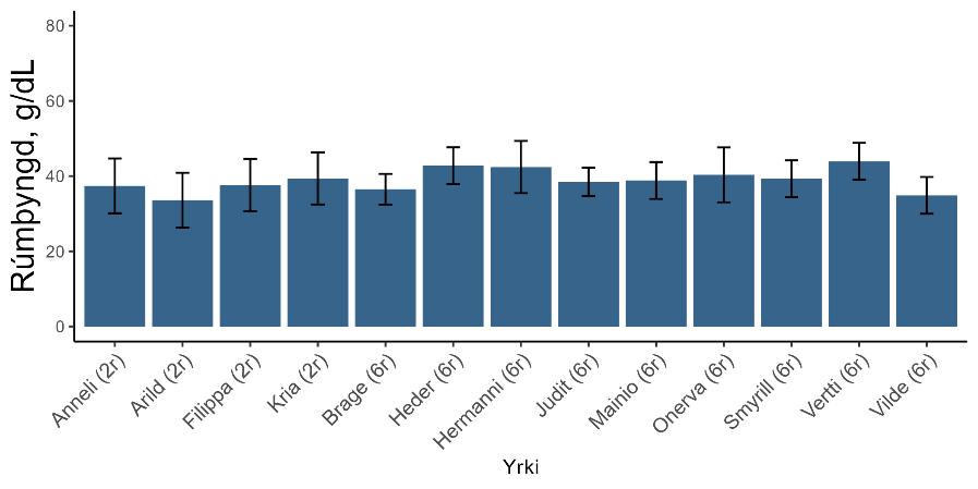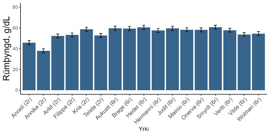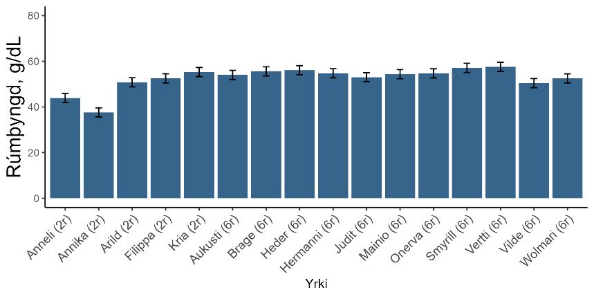 Rúmþyngd mældist á bilinu 43,6-63,7 g/dL, svipuð að meðaltali hjá öllum yrkjum að undanskildum Anneli og Annika sem skiluðu áberandi lakari rúmþyngd (Mynd 4) Brage og Vertti voru að meðaltali með mestu rúmþyngdina af sexraðayrkjunum og Kría af tvíraða með yfir 60 g/dL.