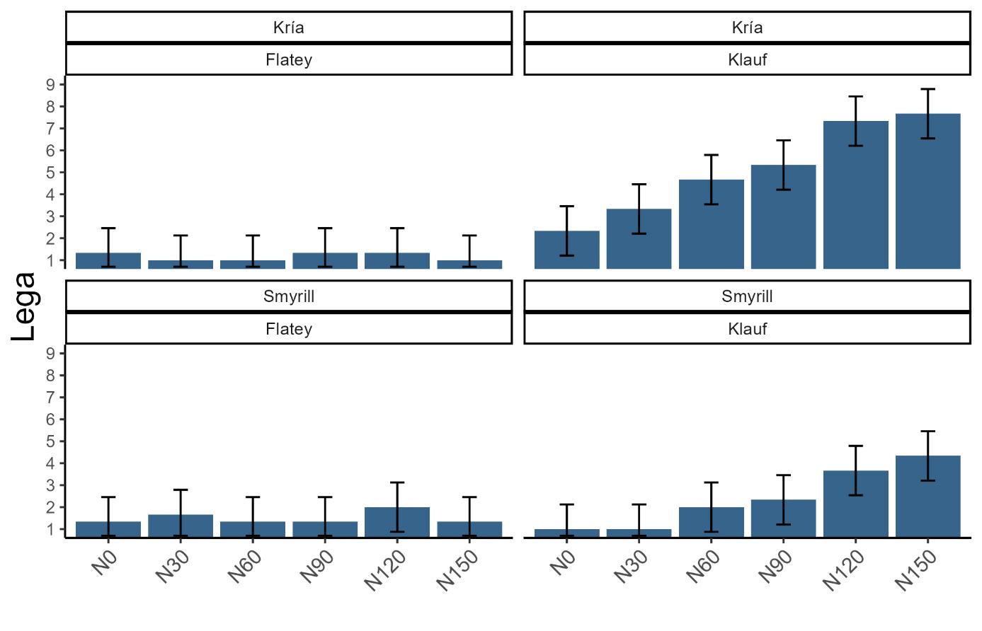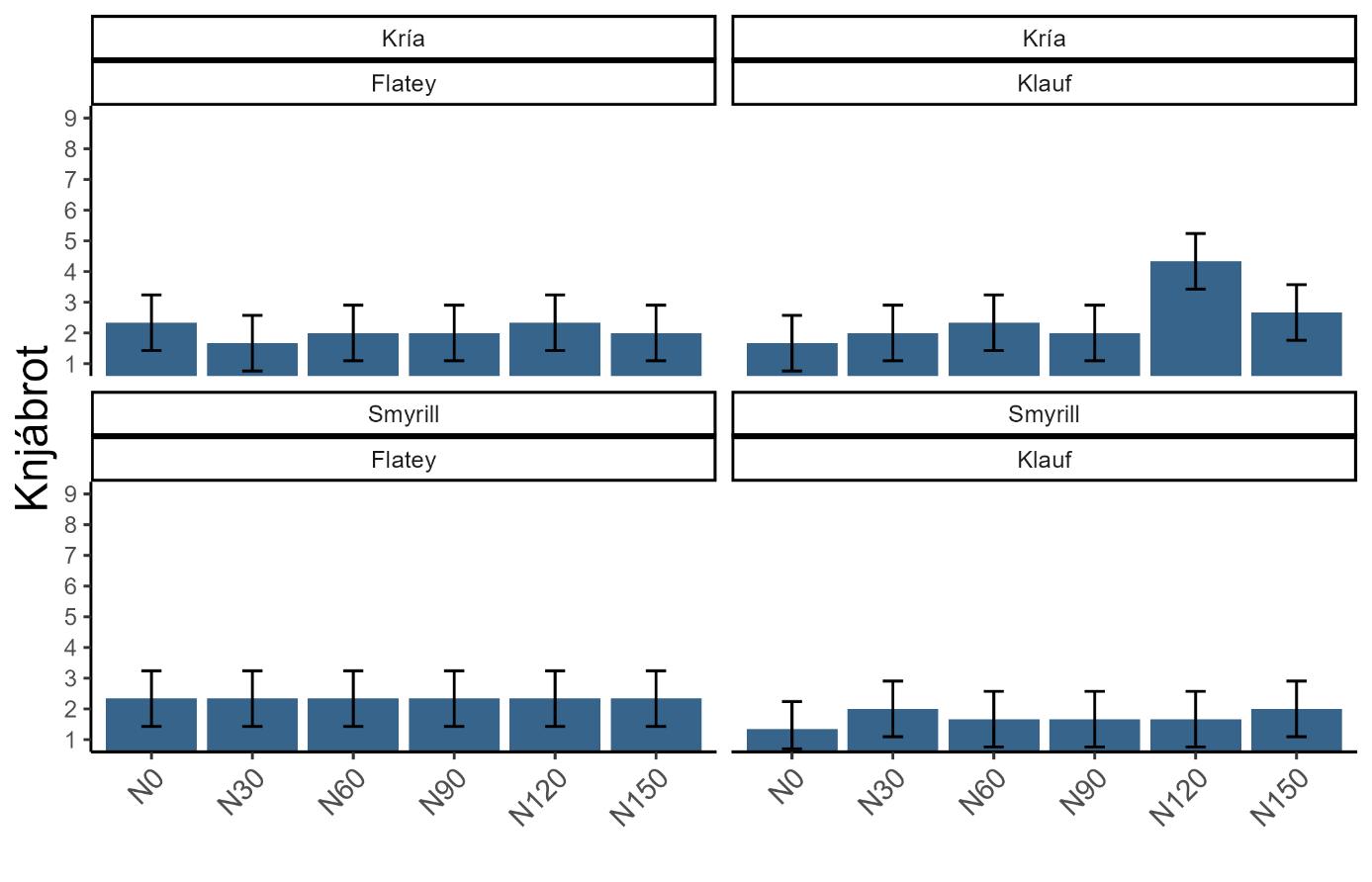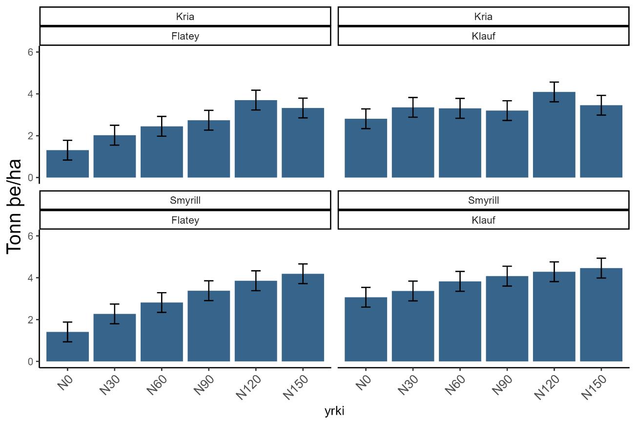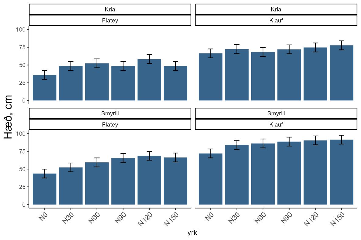 Á Flatey urðu plönturnar hærri eftir því sem áburðarmagn jókst fyrir Smyril en náðu hámarki við N120 (68,6 cm). Marktækur munur var á milli lægsta skammts og þriggja stærstu skammtana. Fyrir Kríu var N0 með lægstu plönturnar (36,0 cm) og N120 með hæstu plönturnar (58,3 cm) og marktækur munur var þar á milli.