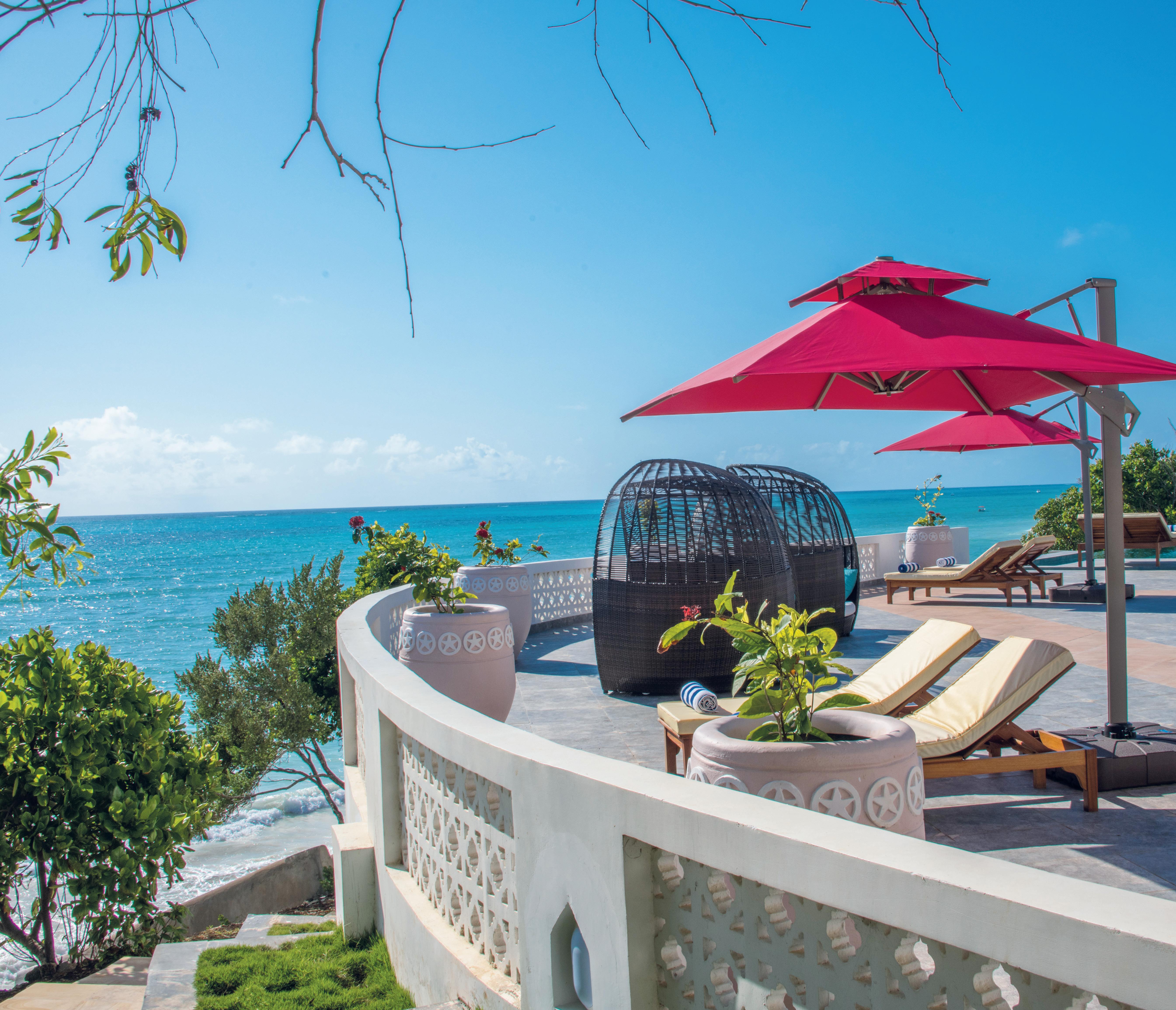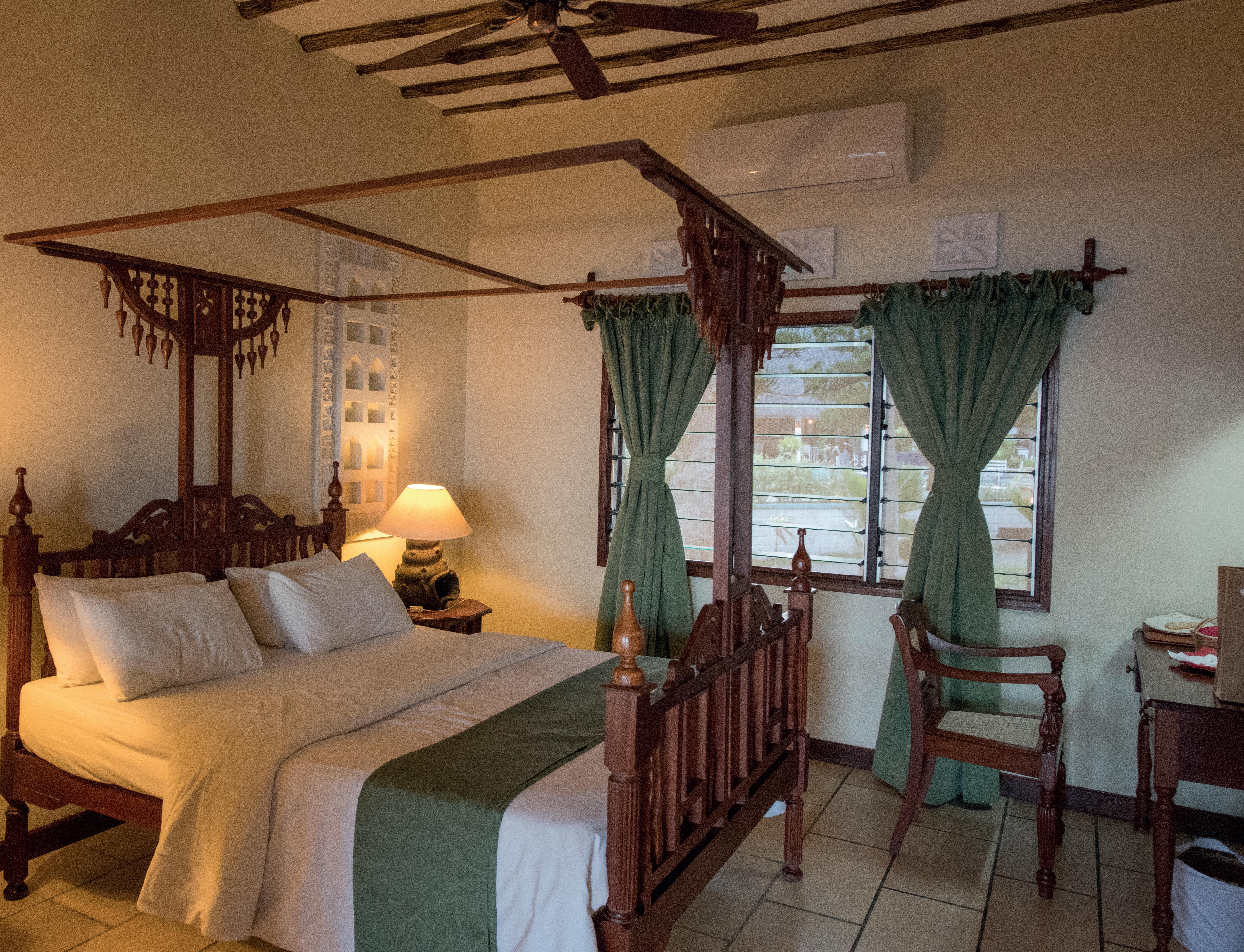 Set in lush tropical gardens with neatly tended lawns dotted with tall swaying palms