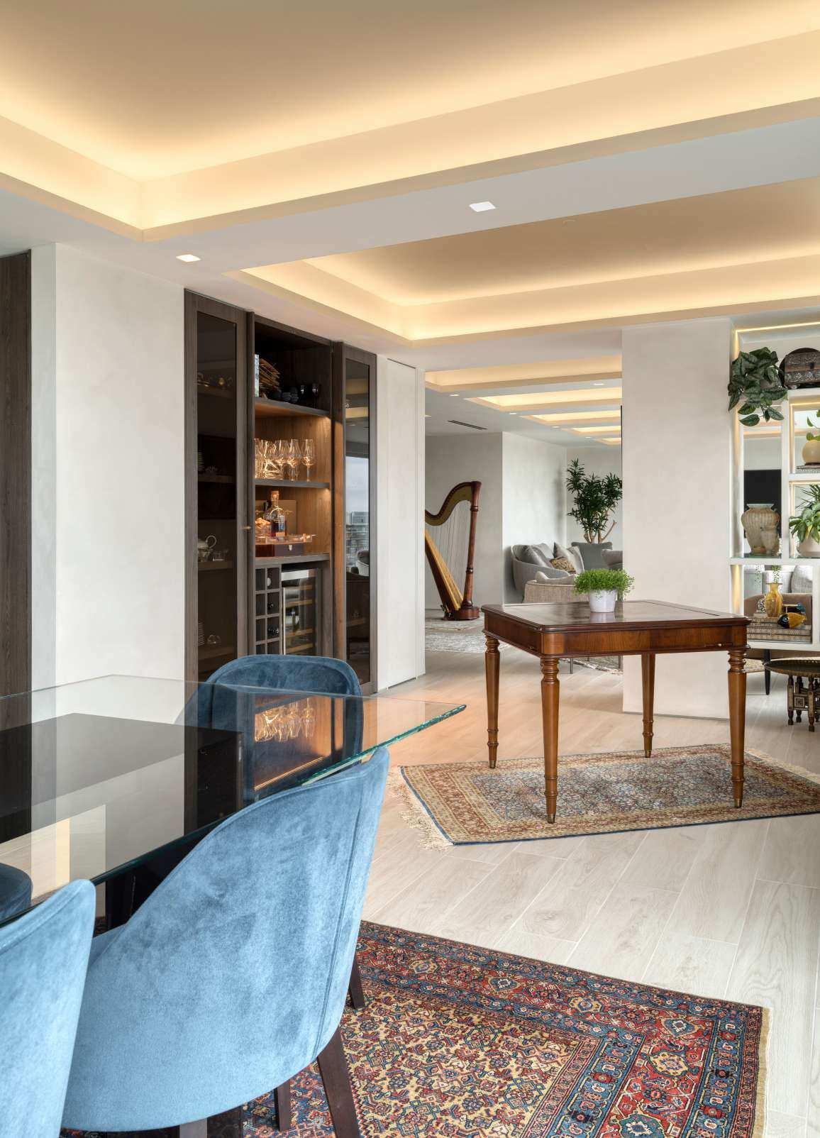 The property was recon昀椀gured to maximise the space by opening up the formal areas, enlarging the entertainment spaces and recon昀椀guring the rooms; whilst focusingonexceptionalcraftsmanship and key statement pieces to create a luxurious yet welcoming feel.