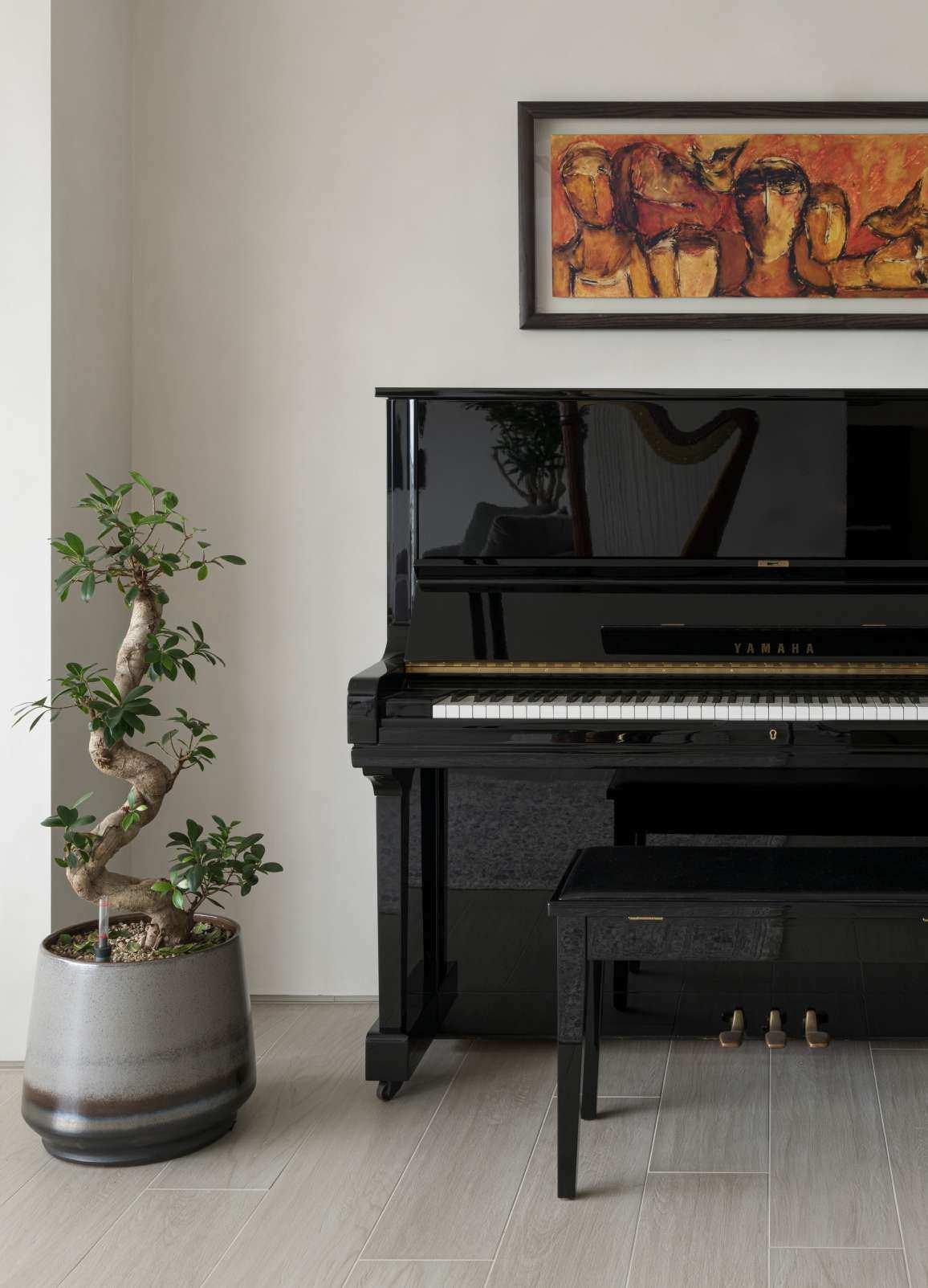 The severely pared back 昀椀nishes are in a direct contrast with the client’s dark and organic art collection. Rich wood carvings shine on the cold concretewallswhilstunexpectedfunky