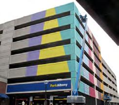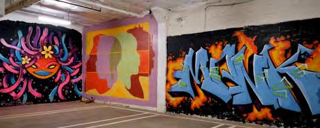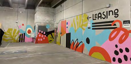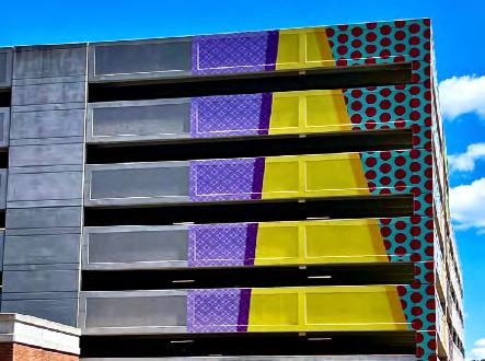There are several opportunities to enhance the public parking garage. Applying vinyl or paint to the glass stairwells could be a cost-effective way to introduce visual interest and improve wayfinding. Exterior artwork could transform the building (currently somewhat of an eyesore) into a giant painted canvas that signals arrival to a major arts district. Interior art installations could create an engaging, artful experience the moment visitors exit their vehicles, while also serving as functional wayfinding elements.