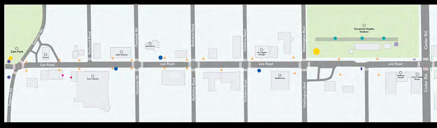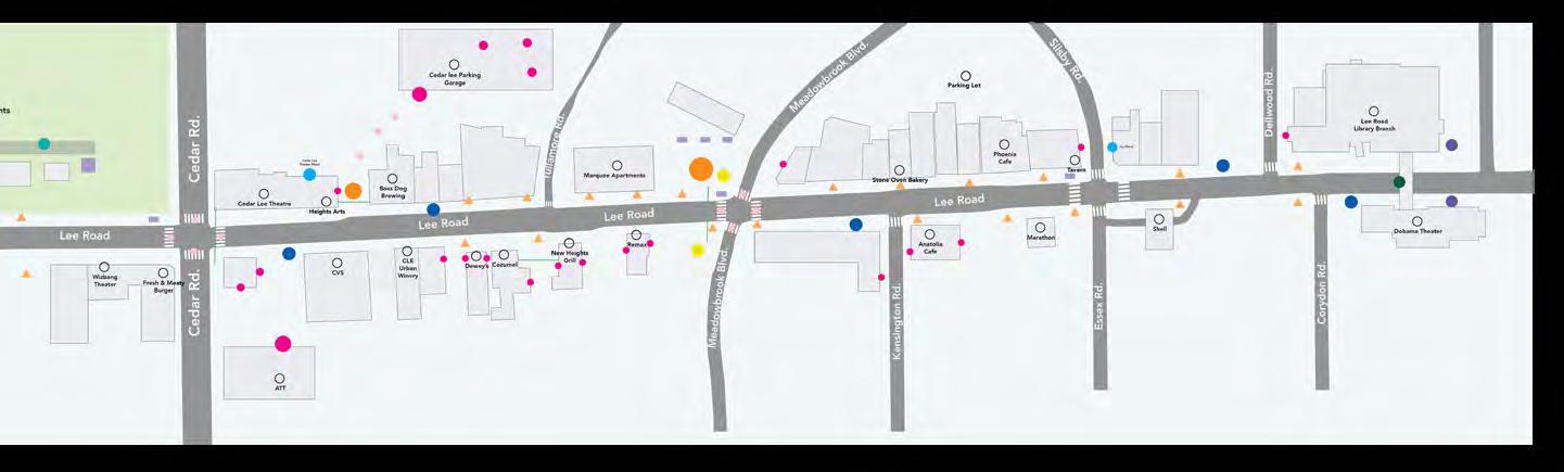 This area is well-suited for the initial phase of concentrated public art due to its arts and culture scene anchored by institutions like Heights Arts and the Cedar Lee Theater and its active restaurants and businesses. There are opportunities to enhance comfort and engagement by creating inviting spaces for waiting, lounging, and exploration. A focused public art initiative, paired with creative visual branding, will help clearly define and promote this area as a dynamic arts district.