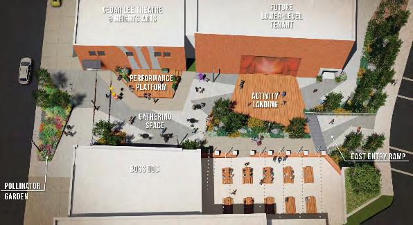 The space outside of Heights Arts already serves as a gathering space for programming and cut-through walkway. With additional art, lighting, landscape, and fuctional enhancements, the space could be stand-out pocket park where district residents and visitors naturally gather at all times of day and evening. We included a budget range for a sculptural or interactive art element to bring attention and interest to the space, but we would also like to explore if a budget has already been developed that goes along with the landscape plan.