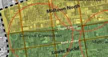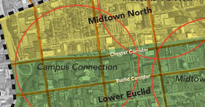 The Campus Connection is the boundary connecting MidTown and Cleveland State University. This area is a gap with potential for activation. Below are the focus areas for the Campus Connection: