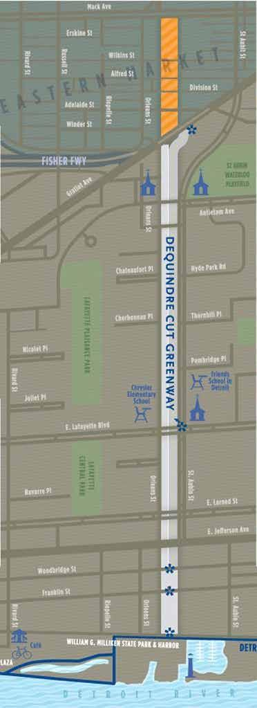 It runs from Gratiot Avenue to Mack Avenue and takes pedestrians into the heart of Eastern Market. Buildings on each side of the Cut along this stretch provide users with a glimpse of what the railway looked like when it was a busy hub of activity bringing people and products to Eastern Market and to the Detroit Riverfront.