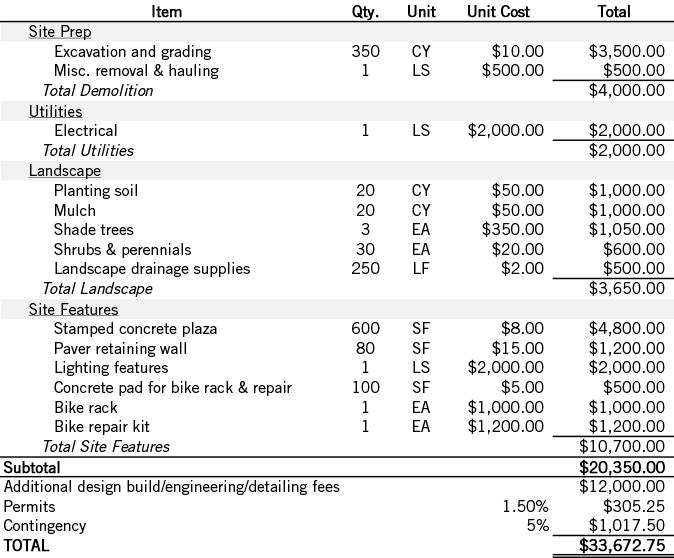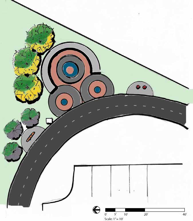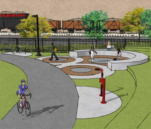The design of this space is intended to improve the aesthetic value of the trail while providing an area for users to engage while taking a break. A circular well-lit plaza, partially shaded with vegetation, insures safety while providing comfort and an ample scope of relaxation for individuals using the path. Incorporating amenities like bike stations, the space becomes a destination for cyclists and friends while increasing the value of the space. By improving the quality of the space, a sense of place and community for residents and incomers is hoped to be achieved.
