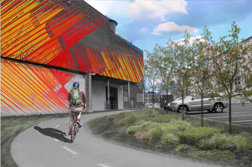 The approach focuses on Warehouse West Wall (2), Trail Activation (9), and the Parklet Greenspace . This portion of the Edison footprint is a high traffic, high visibility area where multiple treatments can be demonstrated.