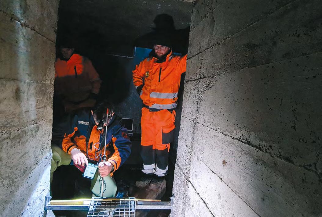 ▲ Misurazione della portata delle sorgenti Cunfin (Val Gardena): Hartmann Stuefer (al centro, in primo piano) con i tecnici idropotabili del Comune di Ortisei